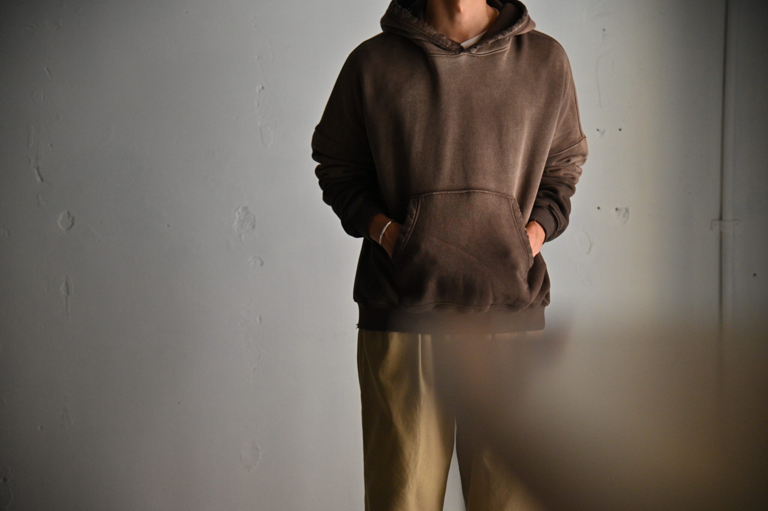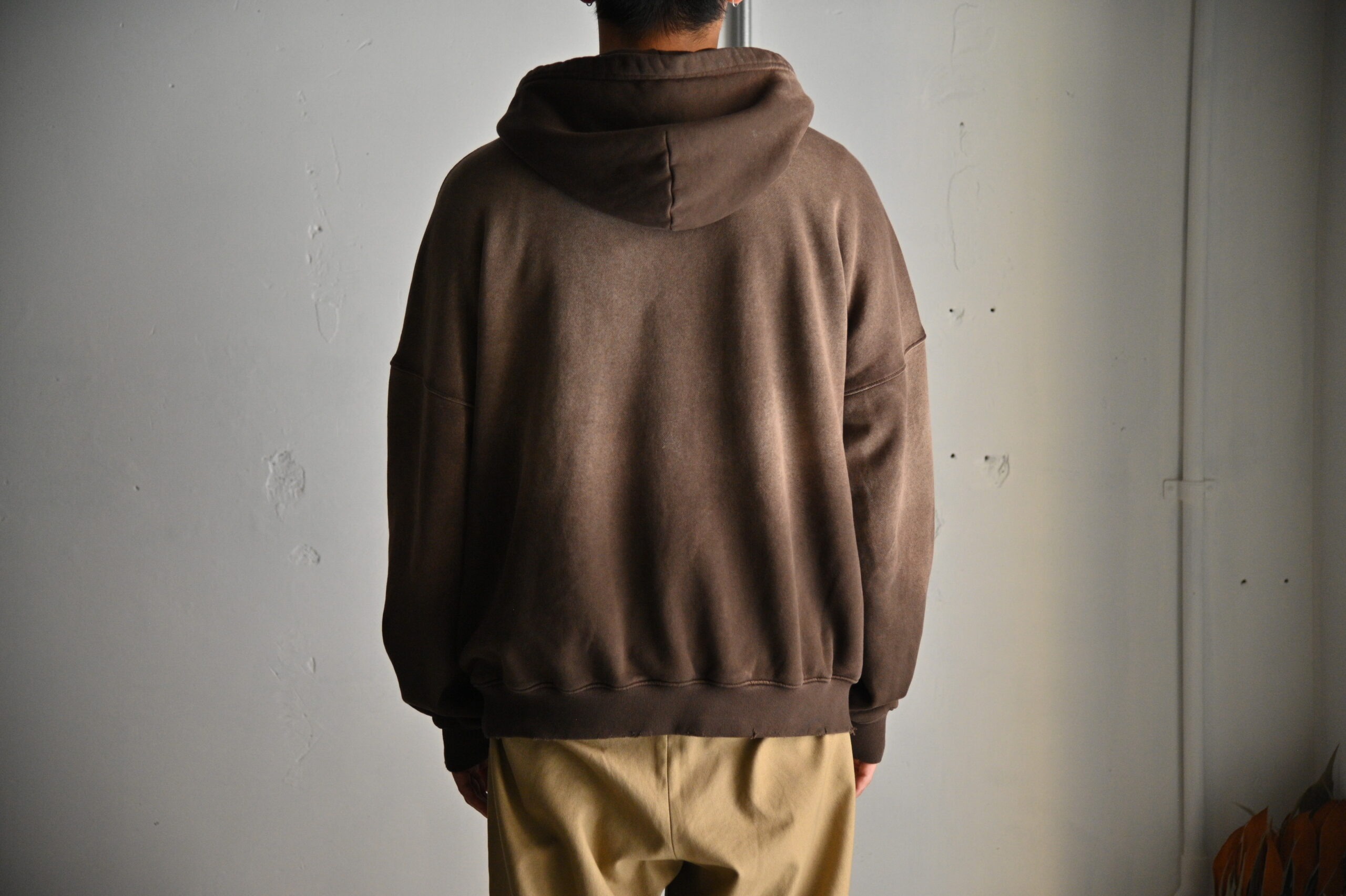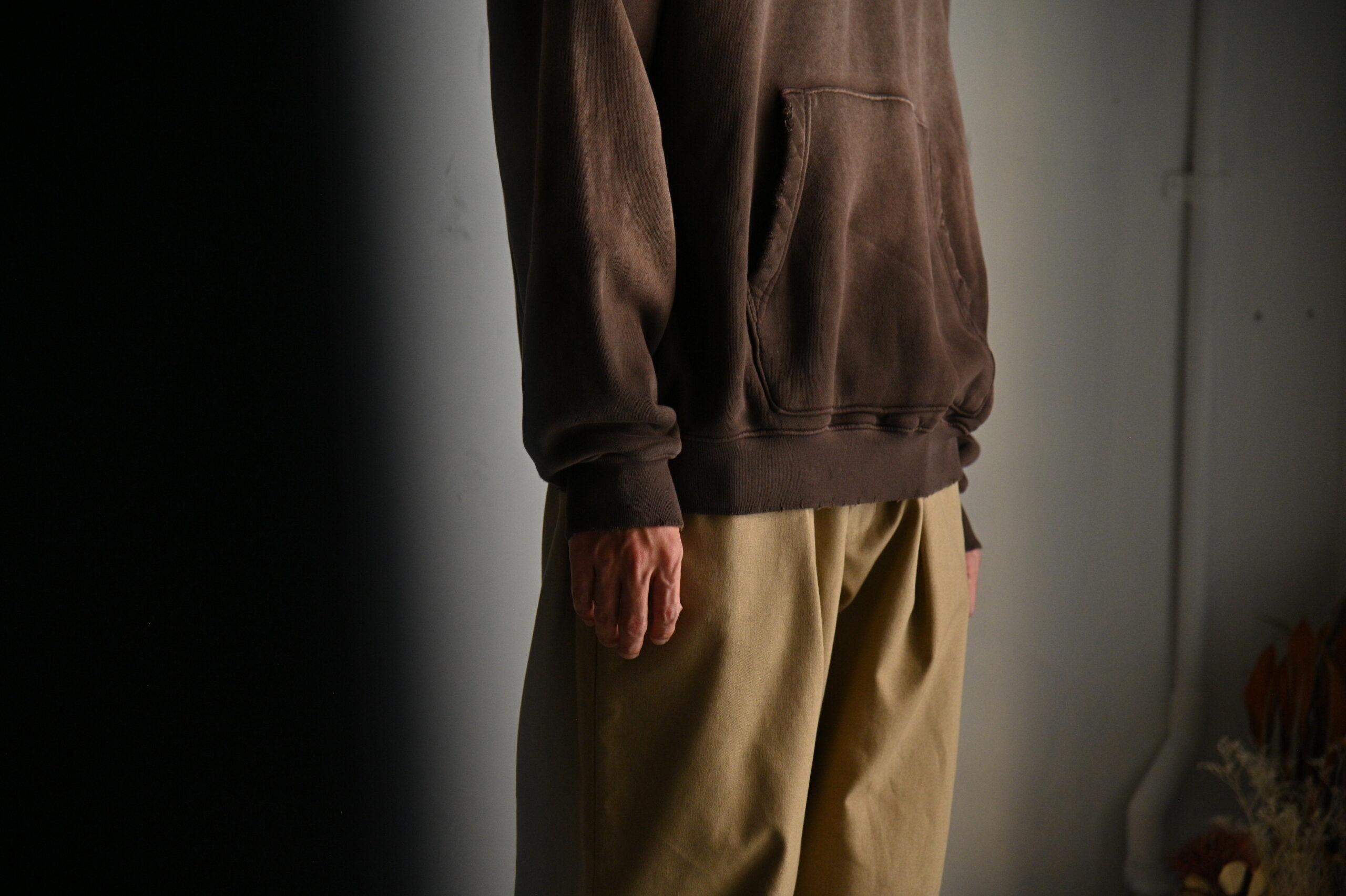 長年使い込まれたかのようにリアルな褪色&ダメージ加工が施されたスウェットパーカー。