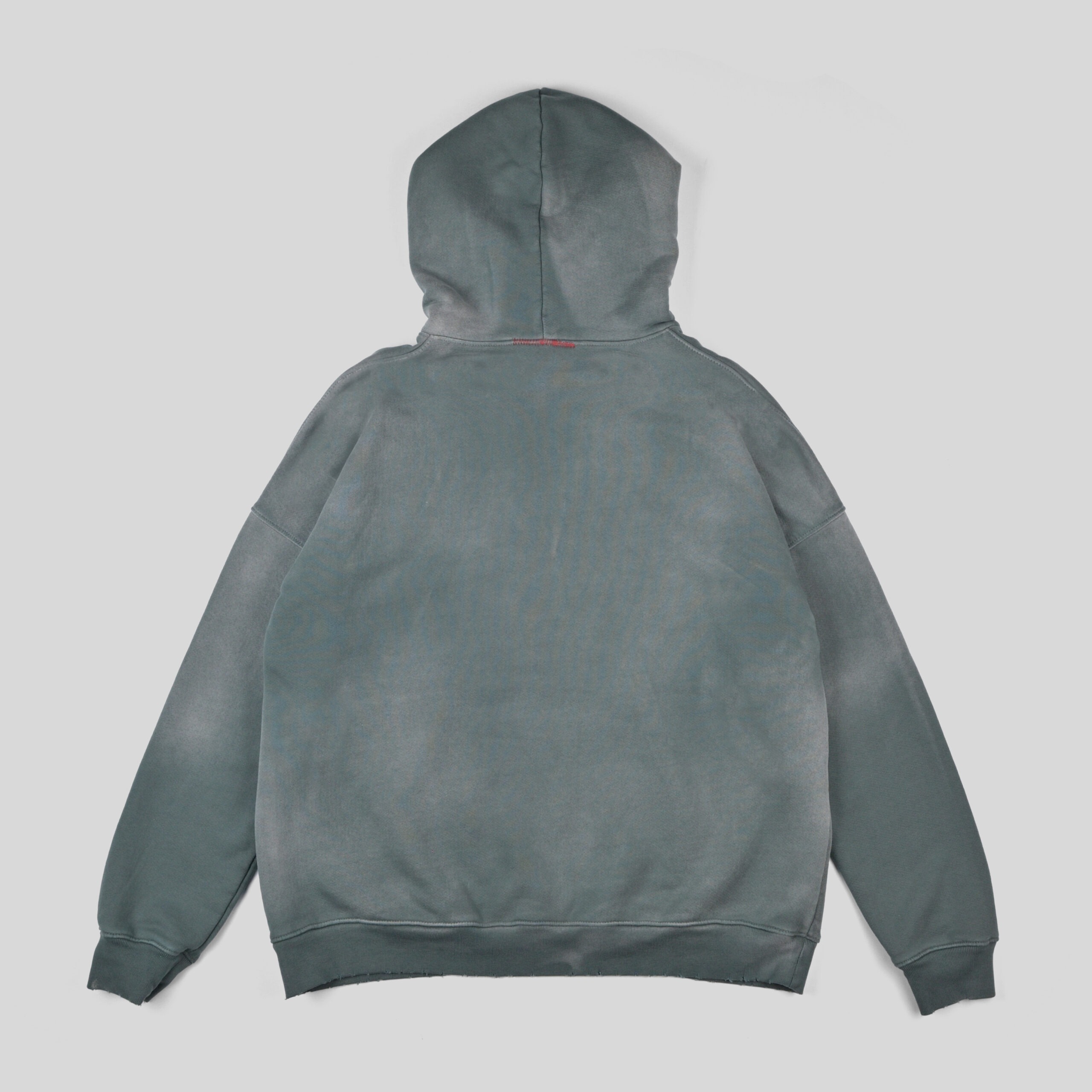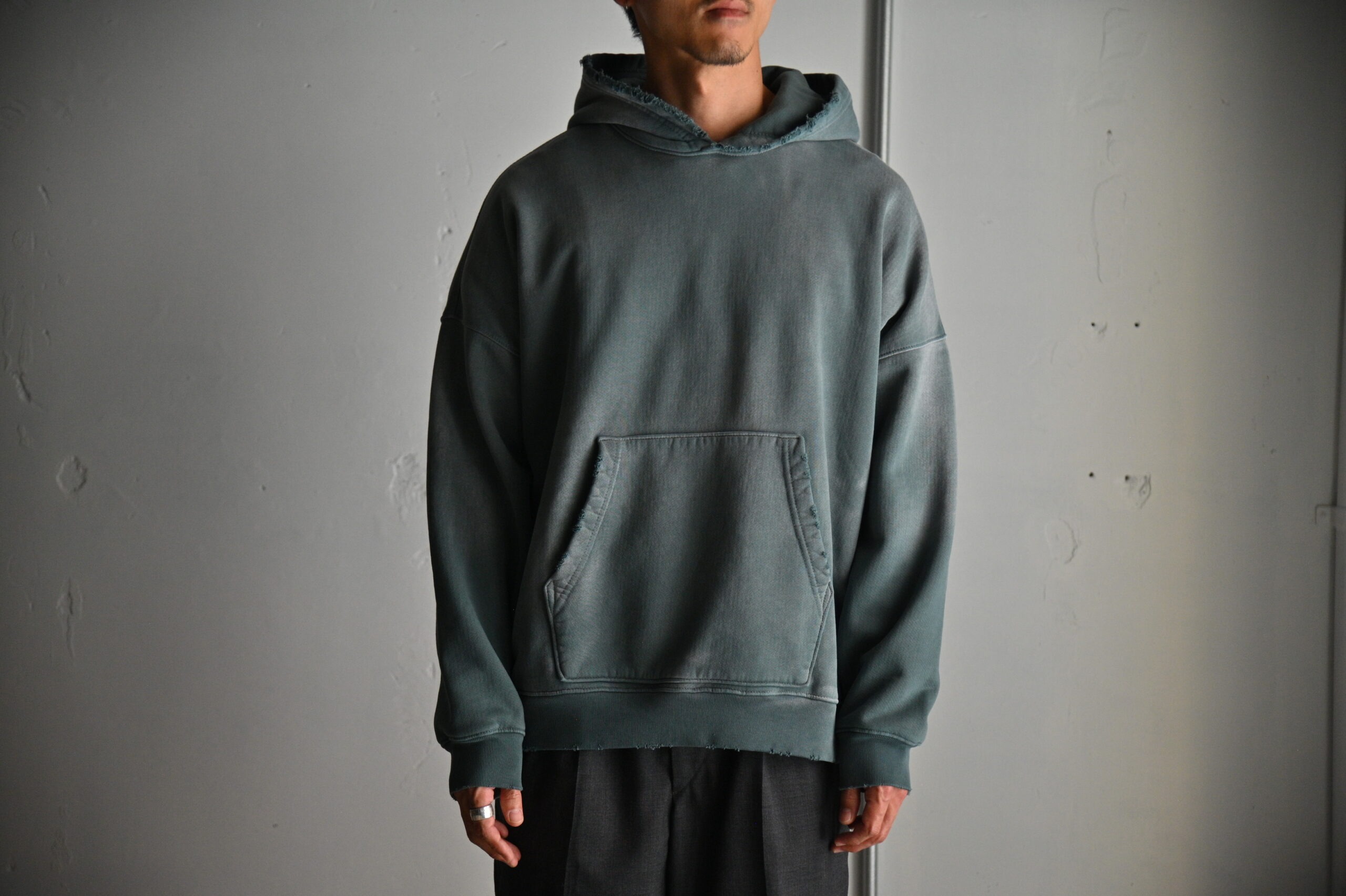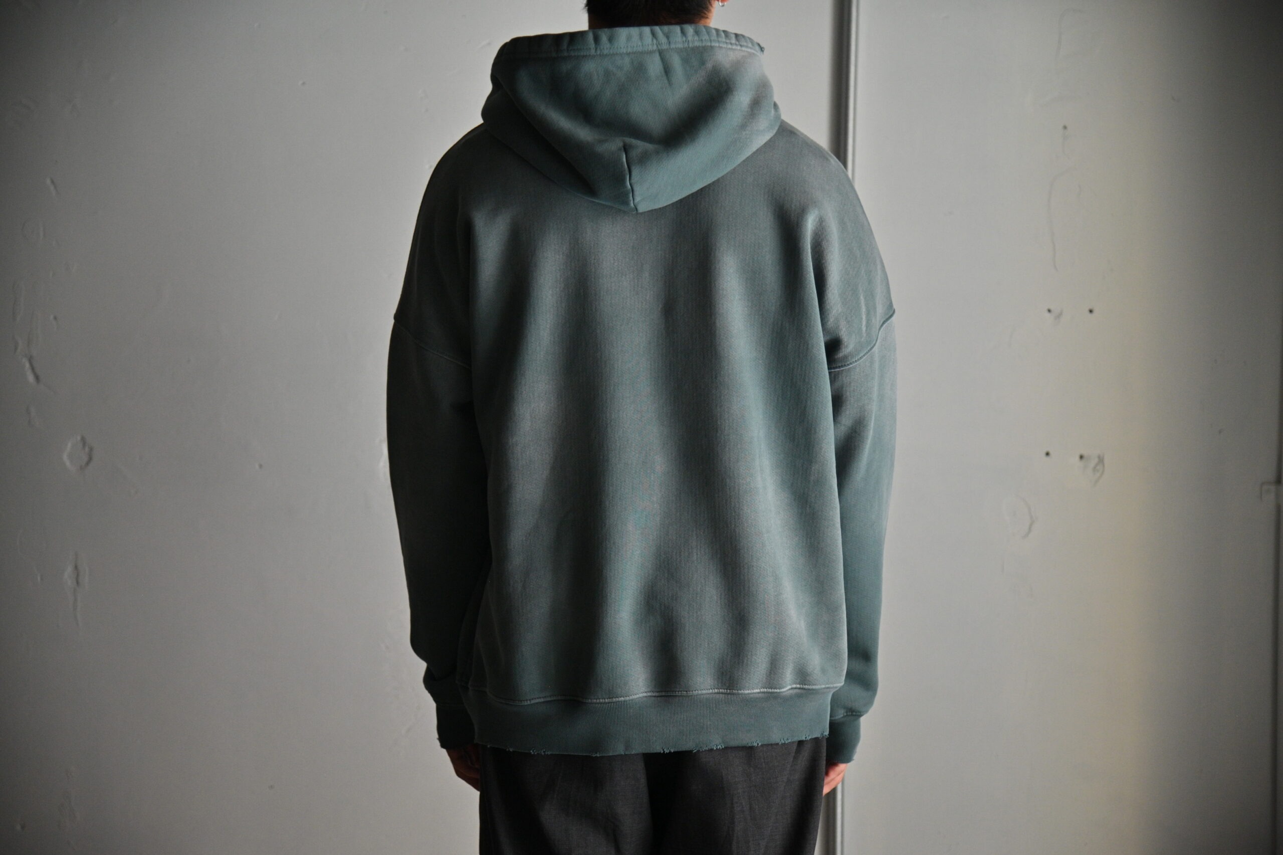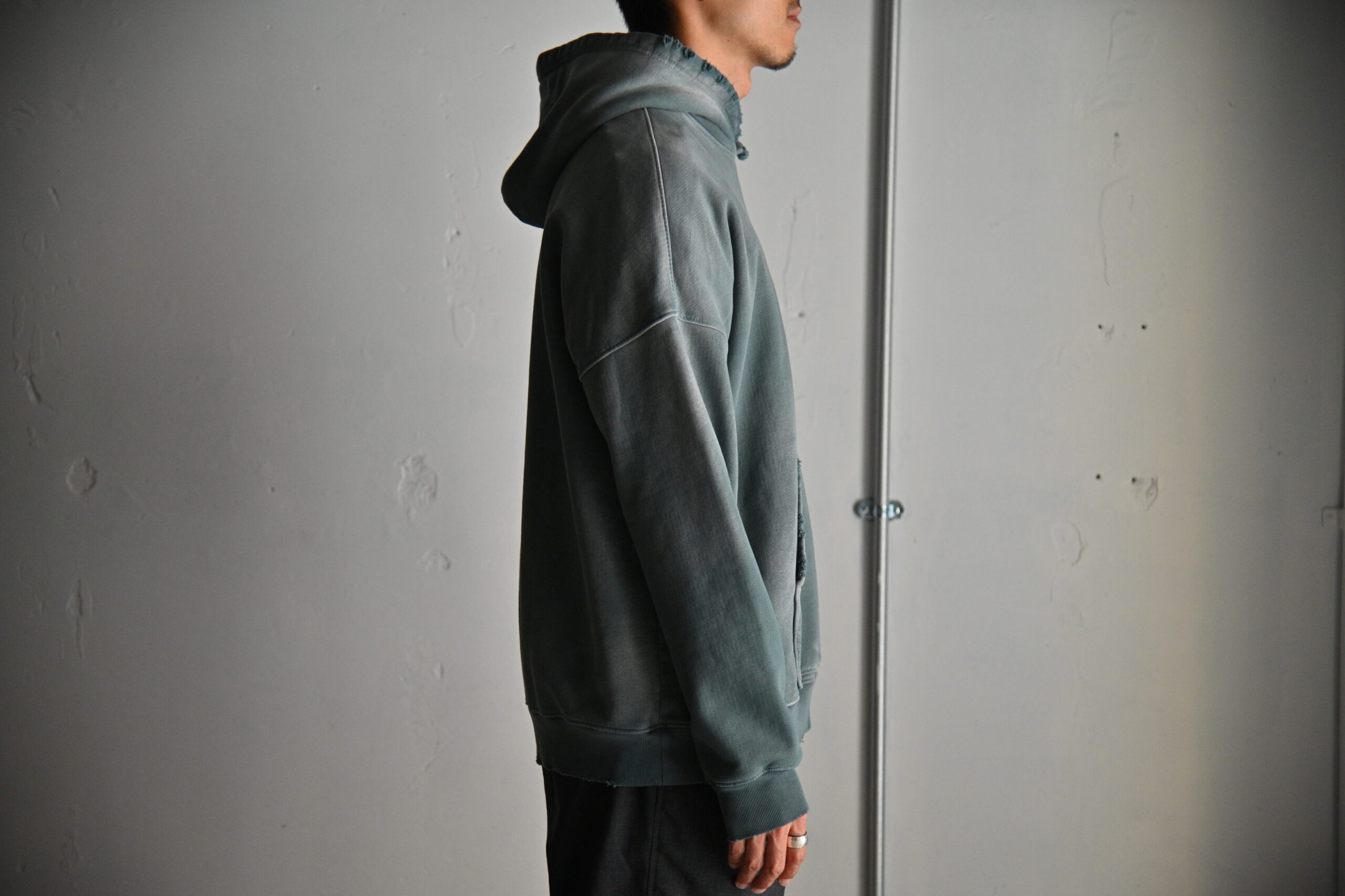 長年使い込まれたかのようにリアルな褪色&ダメージ加工が施されたスウェットパーカー。