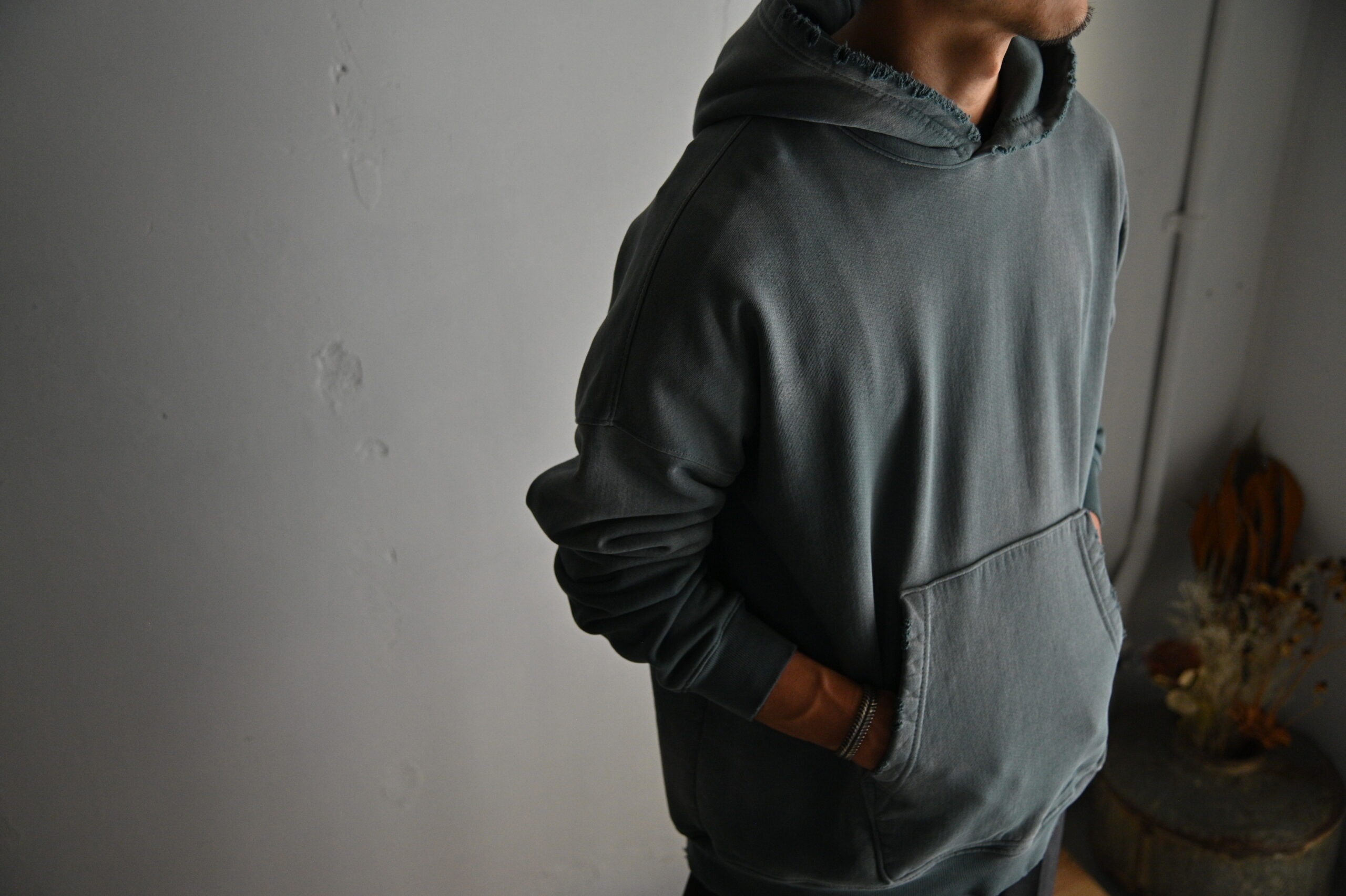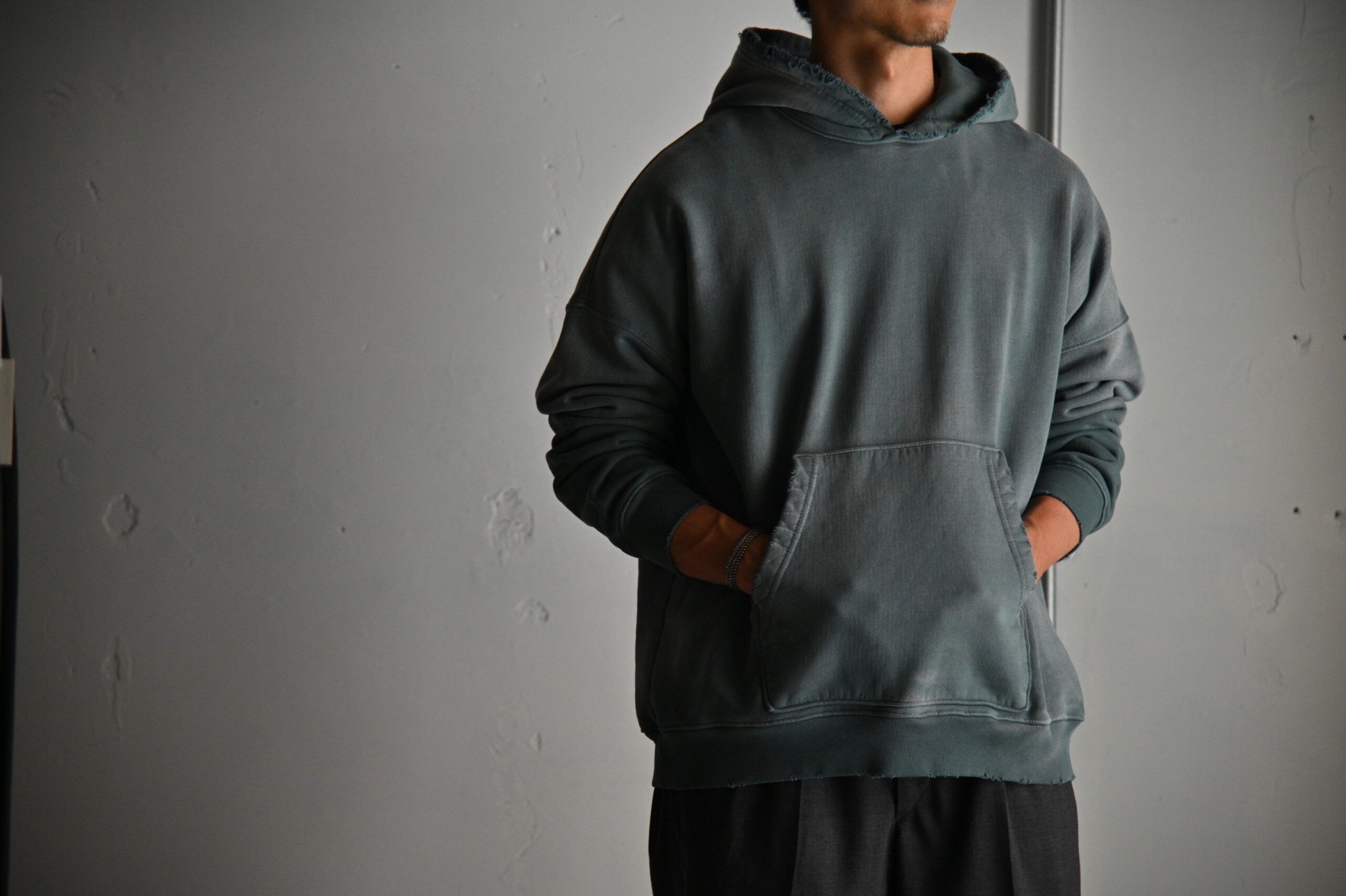 彼はブランドスタート前、主にデニムブランドの生産、デザイン、クリエーティブディレクターを務めており、当時からユーズドデニムのような色落ち、日焼けをしたカットソーにも興味をもっていました。