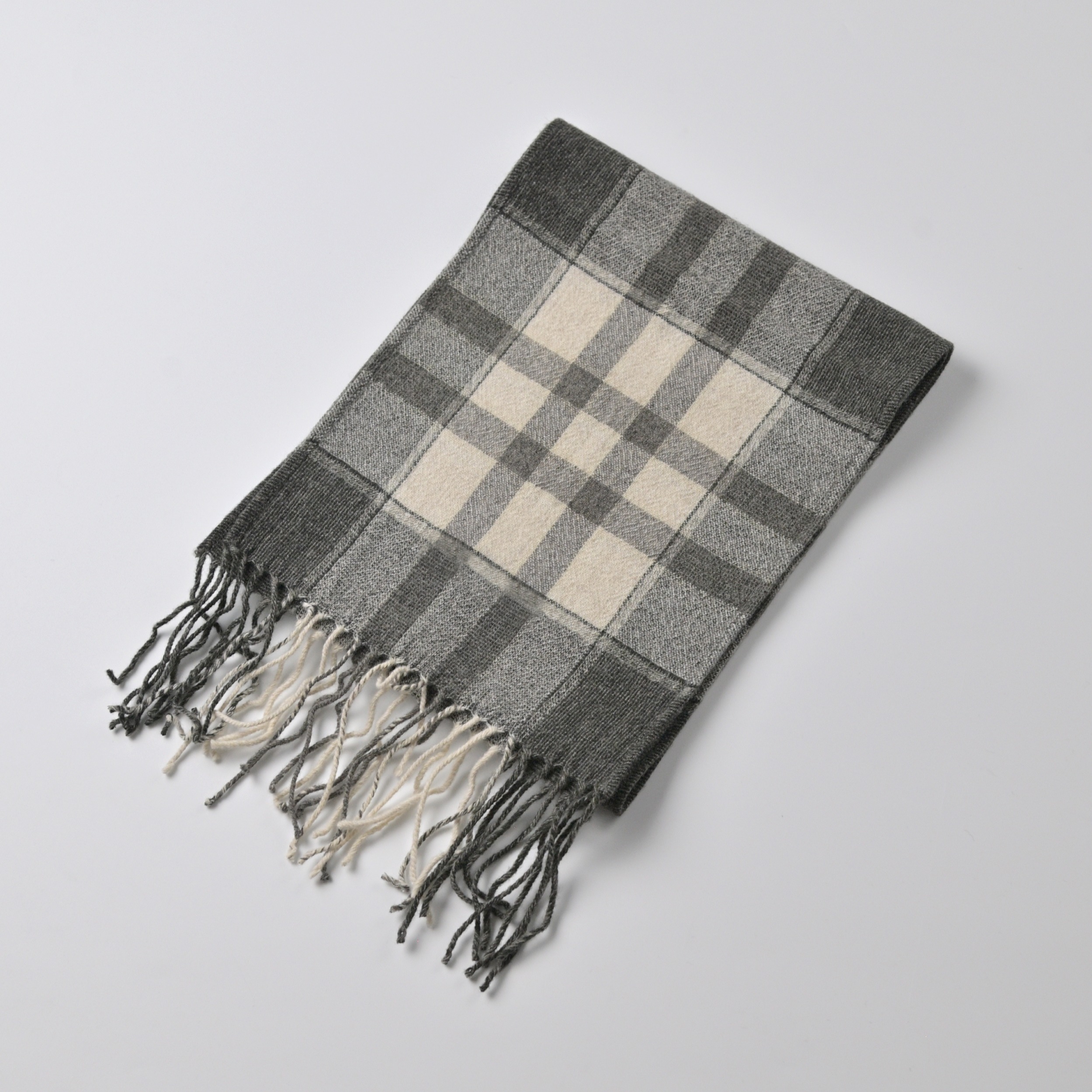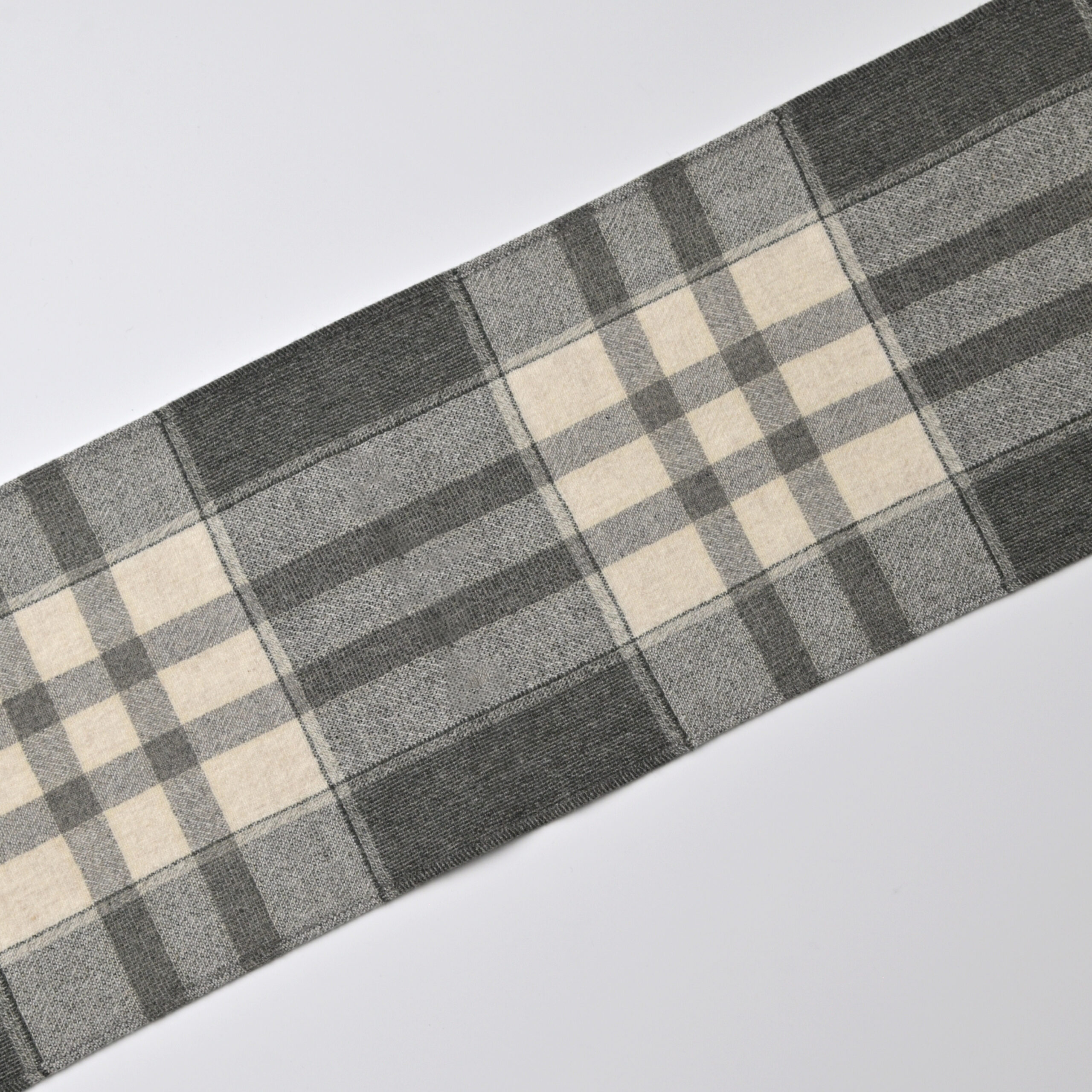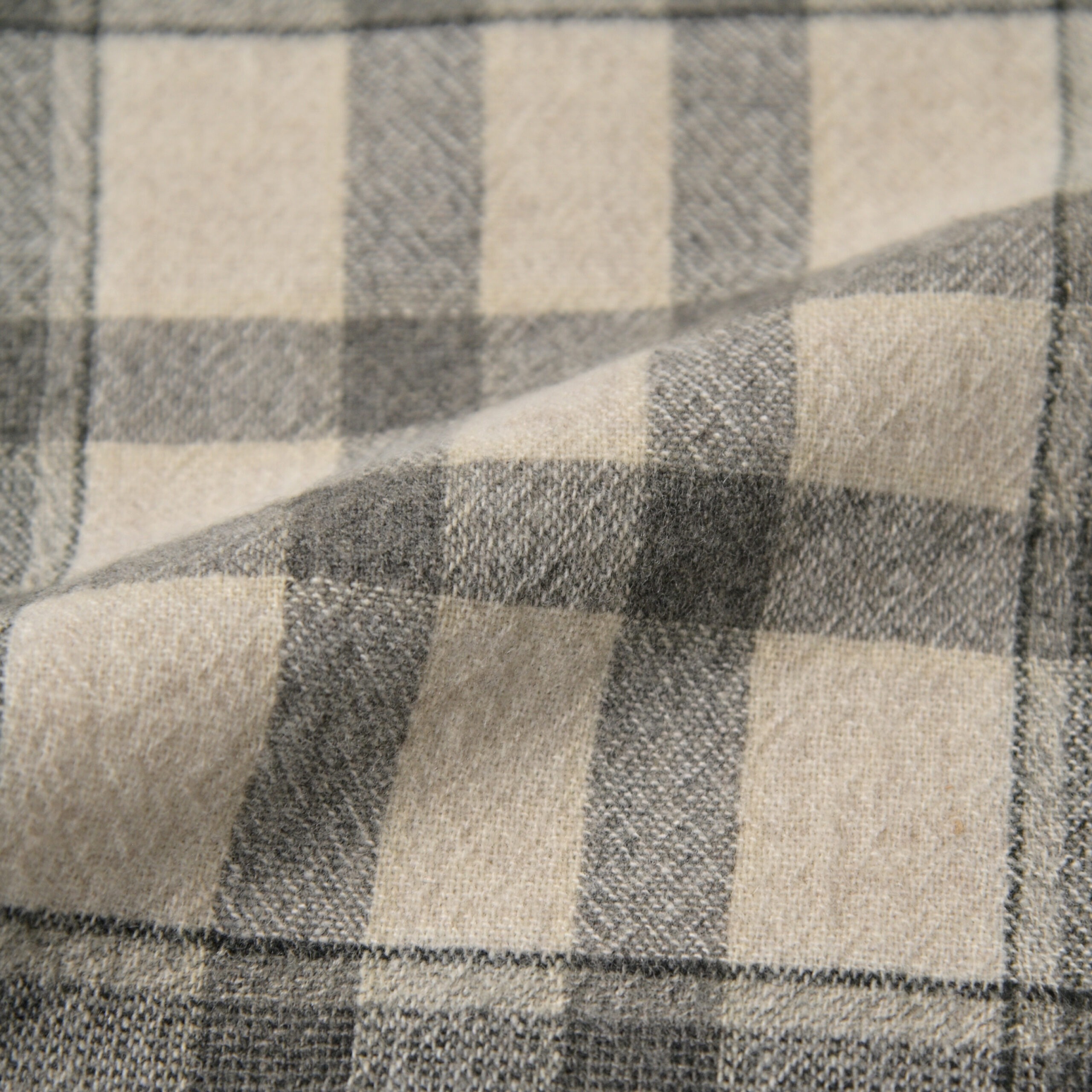 タスマニアウールとカシミアの混紡糸のチェック地。あえて平織で規格を甘くして製織しているため、ワッシャー加工で幅 丈を詰めて柔らかい風合いを演出。適度な肉感が特徴。