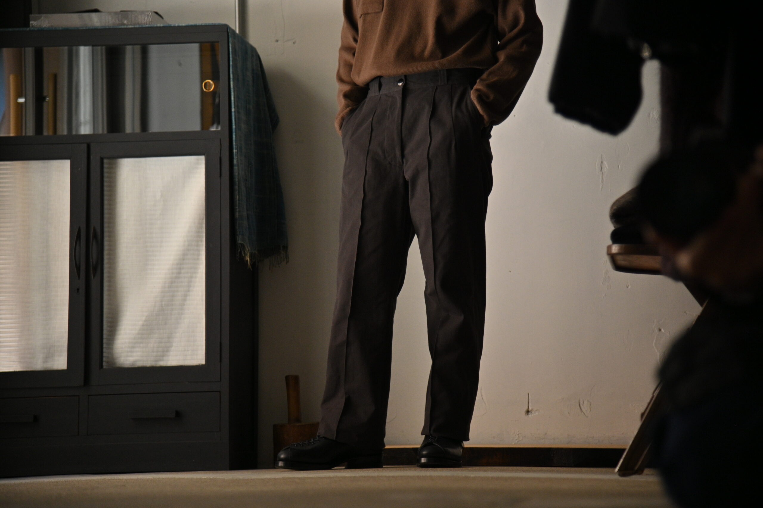 インスピレーションは、ミッドセンチュリー期のミリタリーアーカイブデザインとなり、簡素なデザインの中に 一際目立つディテールのピンタックに、サイドウエストに配されたエラスティックバンドなどの心くすぐられる古き良き 意匠が垣間見れます。