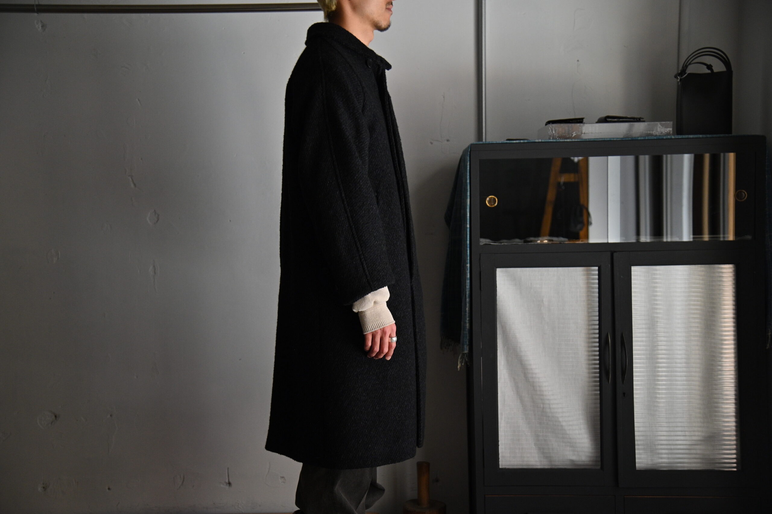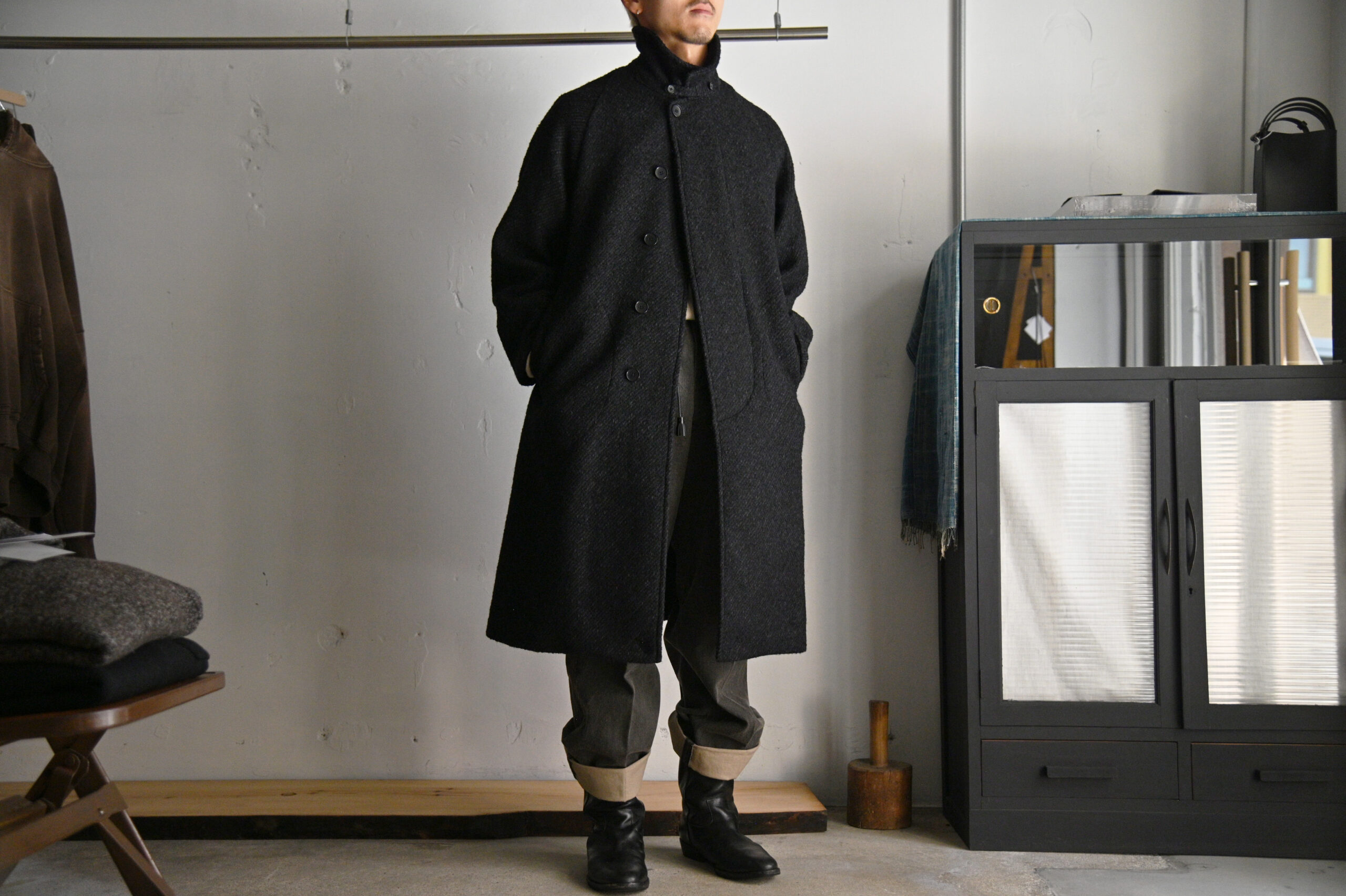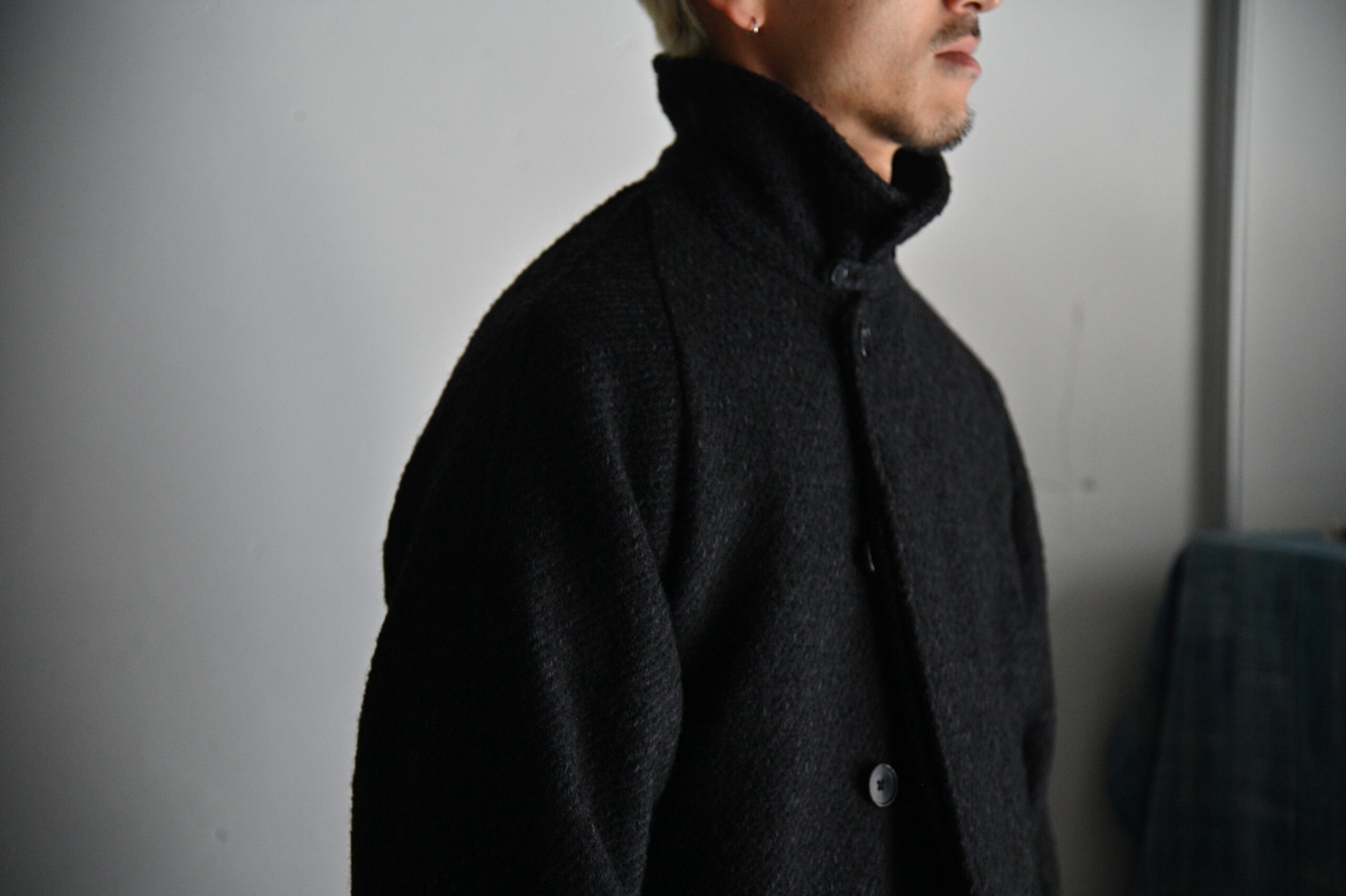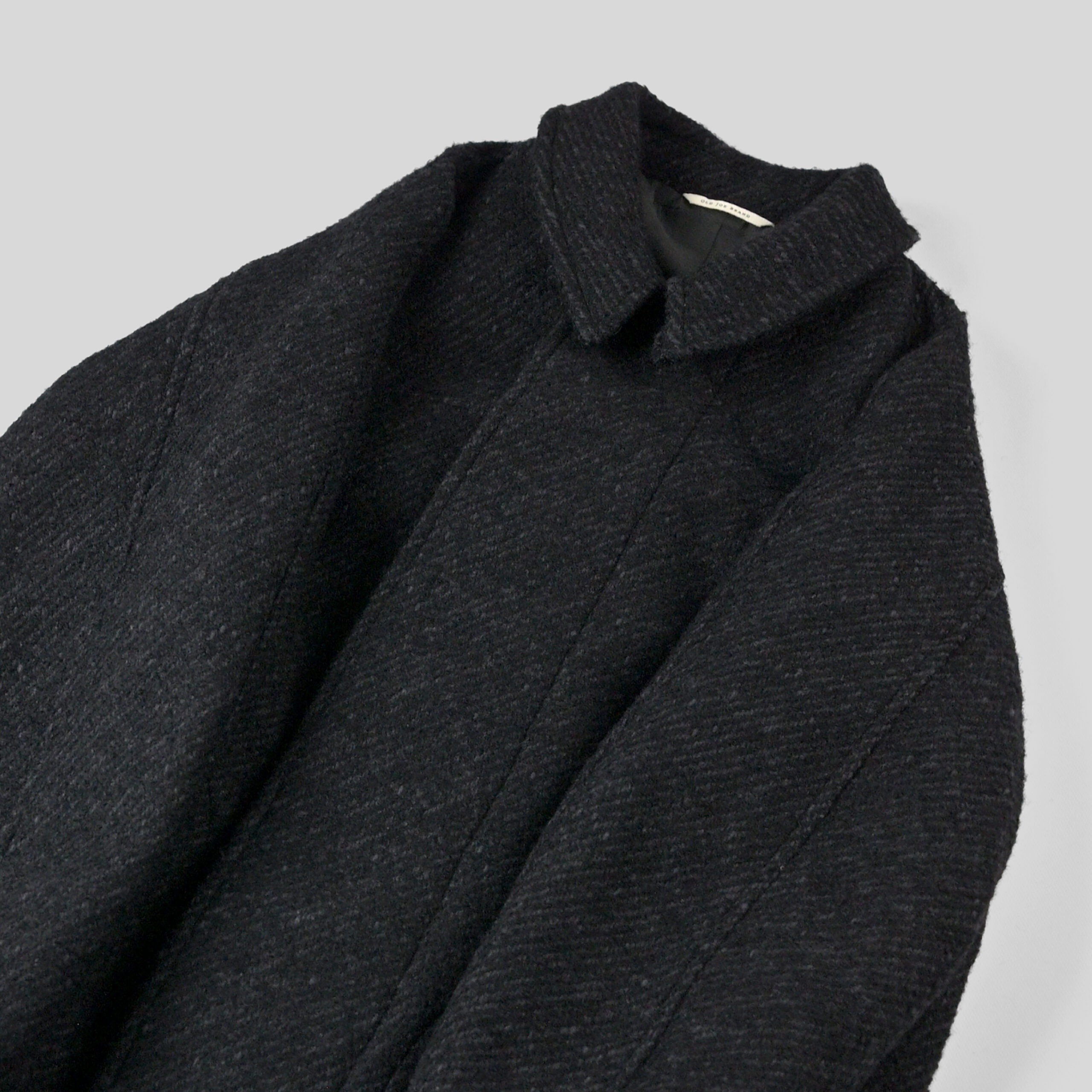 4種の糸で構成し織り上げている為、表面の凹凸感が他にない存在感を醸し出します。凛々しい表情に相反するかのように軽やかな羽織り心地を持つ。動く度に布が綺麗に舞うようにと、マテリアルのウエイトにまでOLDJOEの意匠設計を垣間見ることができます。