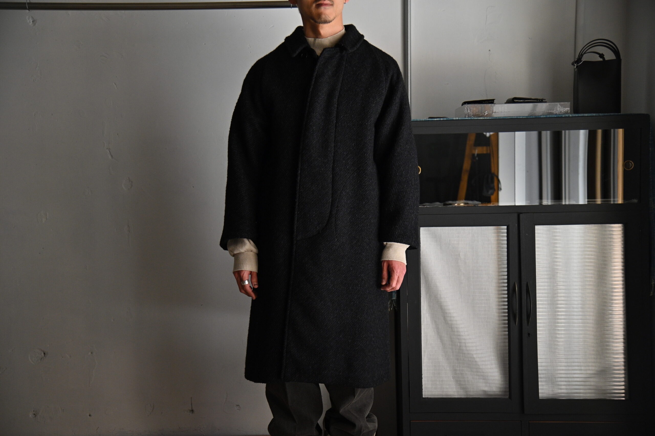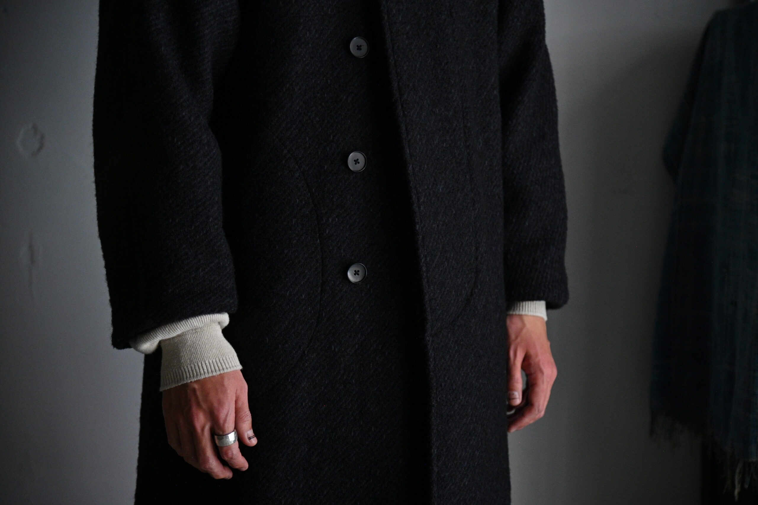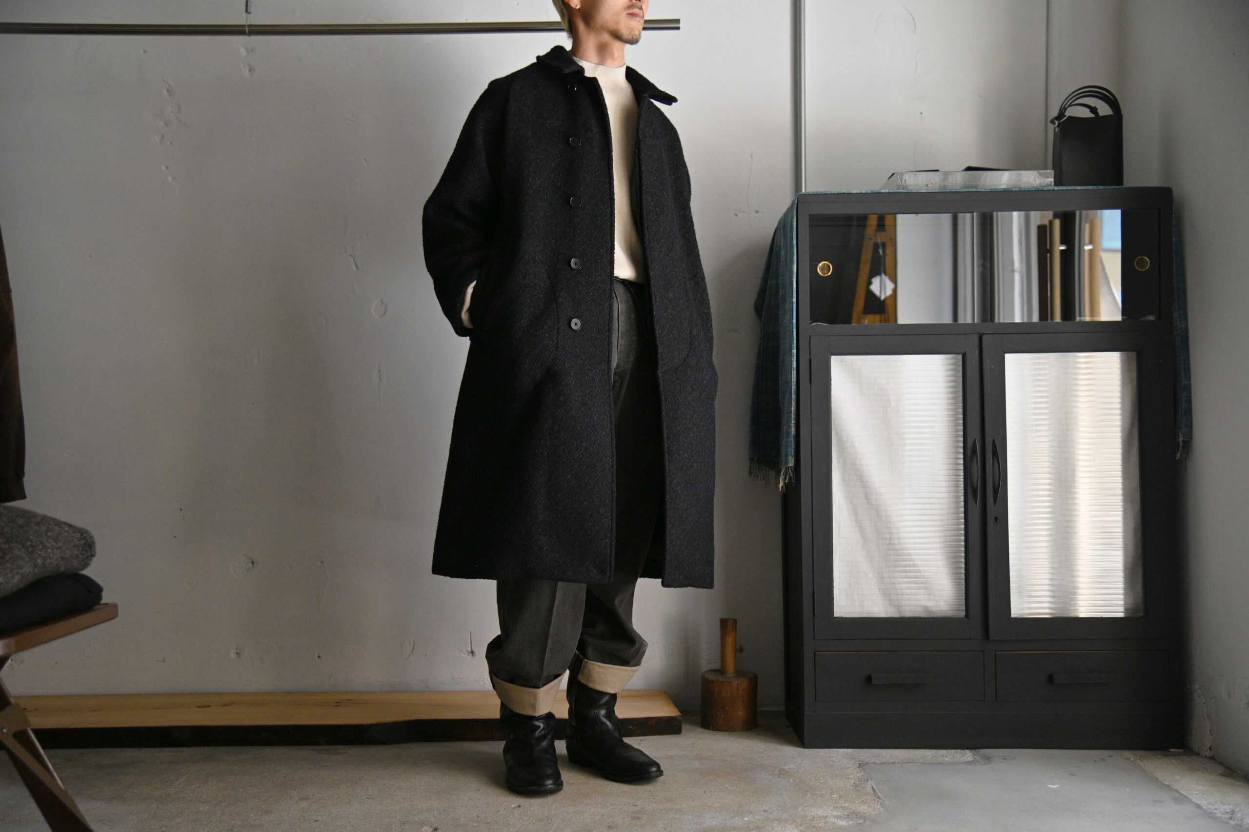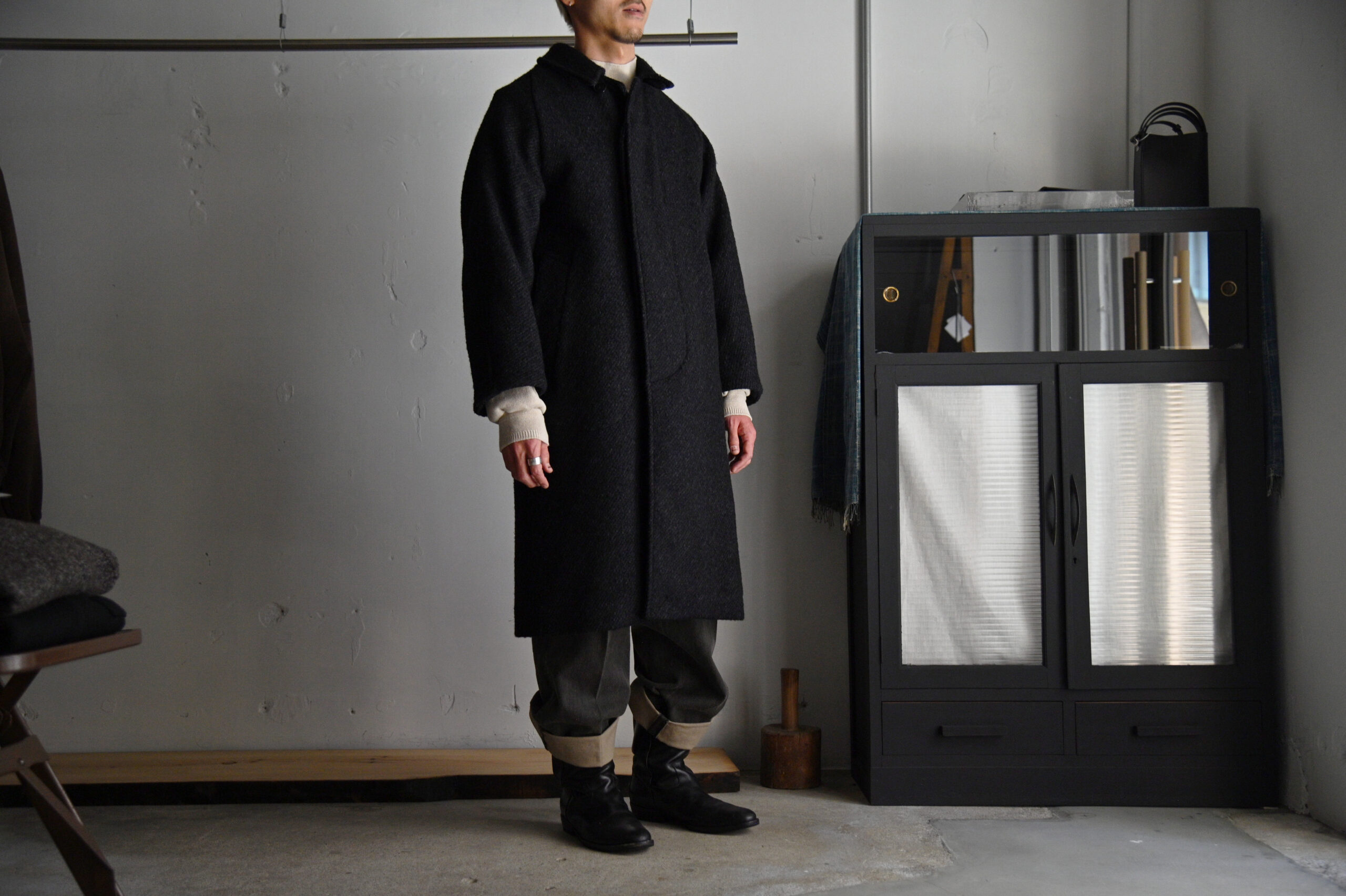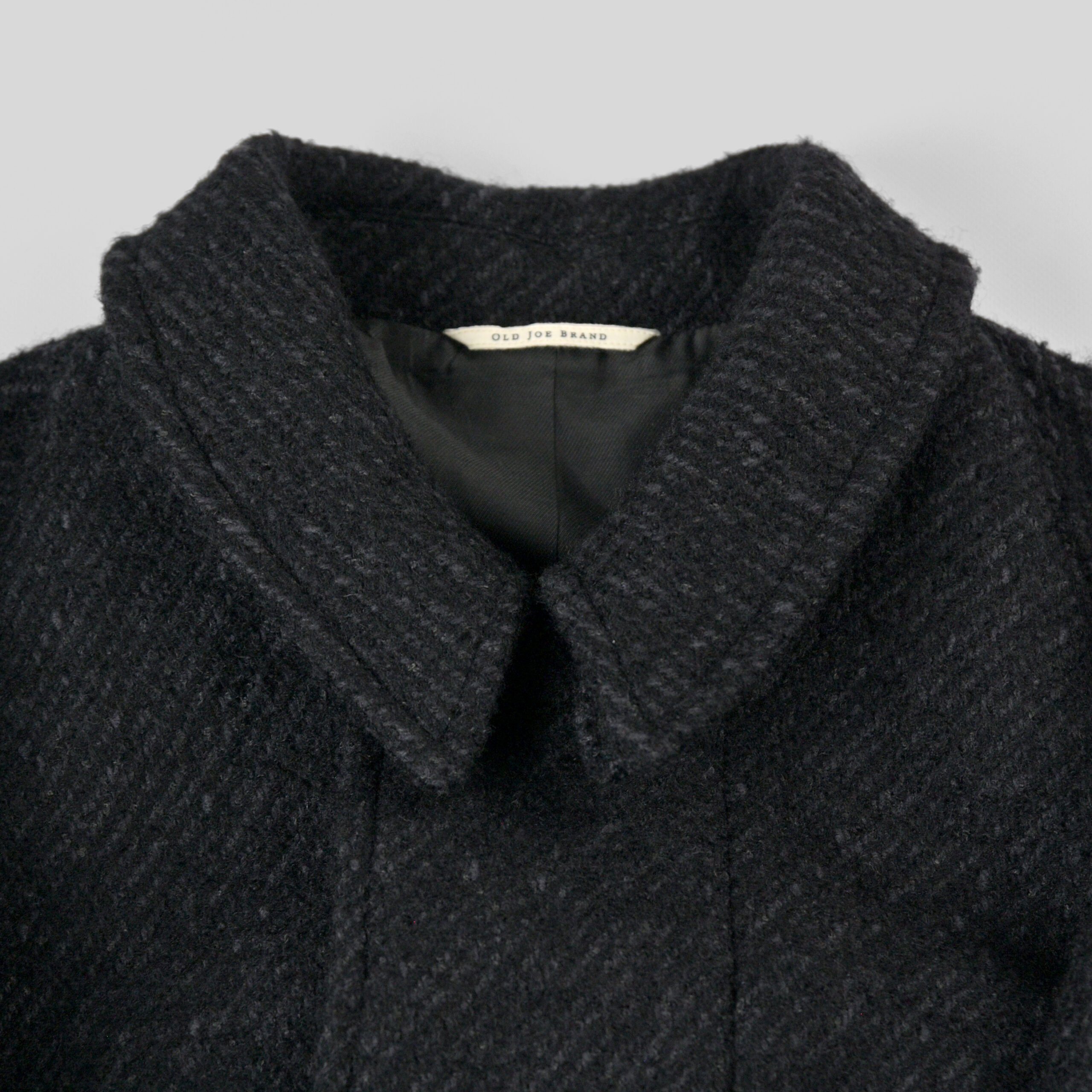 4種の糸で構成し織り上げている為、表面の凹凸感が他にない存在感を醸し出します。凛々しい表情に相反するかのように軽やかな羽織り心地を持つ。動く度に布が綺麗に舞うようにと、マテリアルのウエイトにまでOLDJOEの意匠設計を垣間見ることができます。