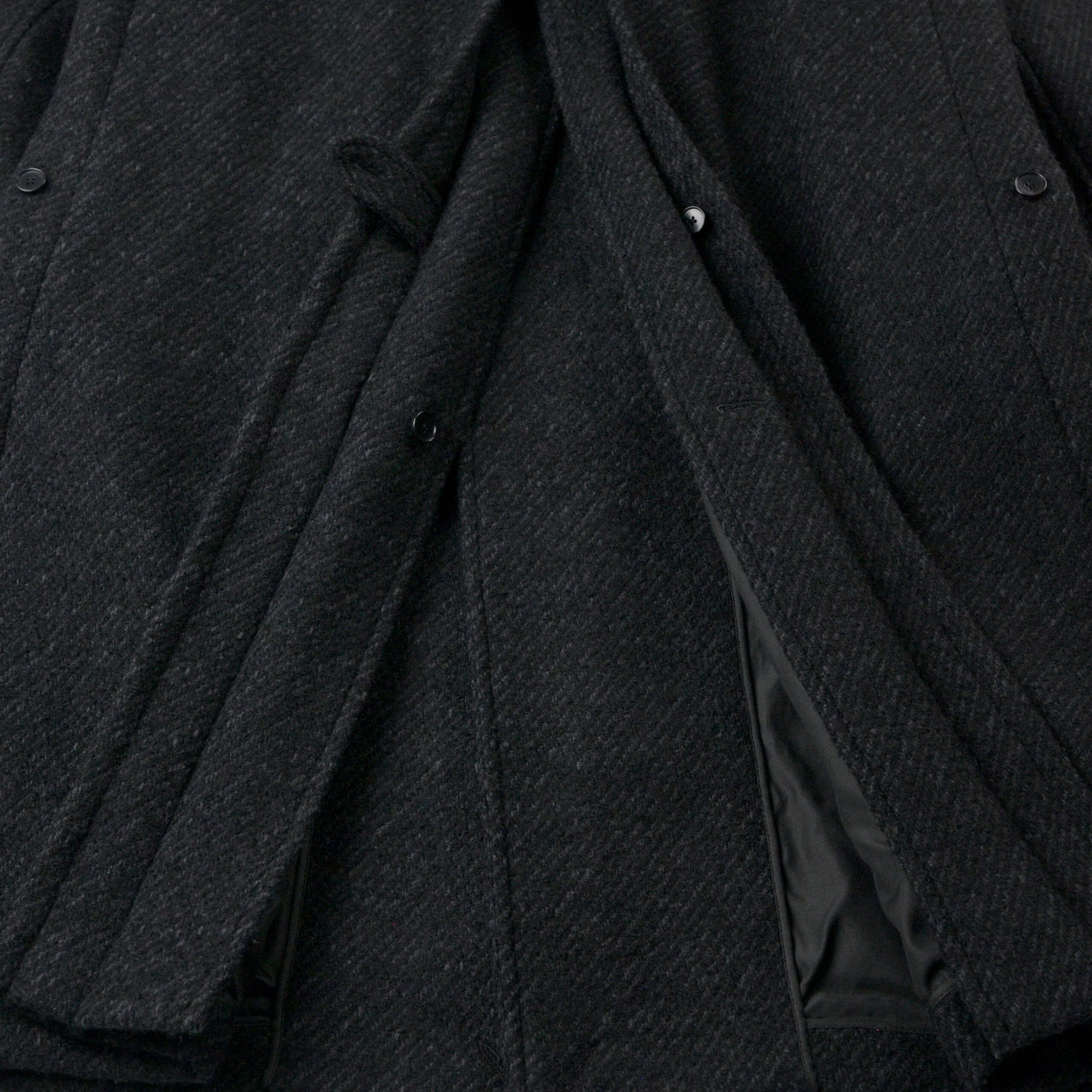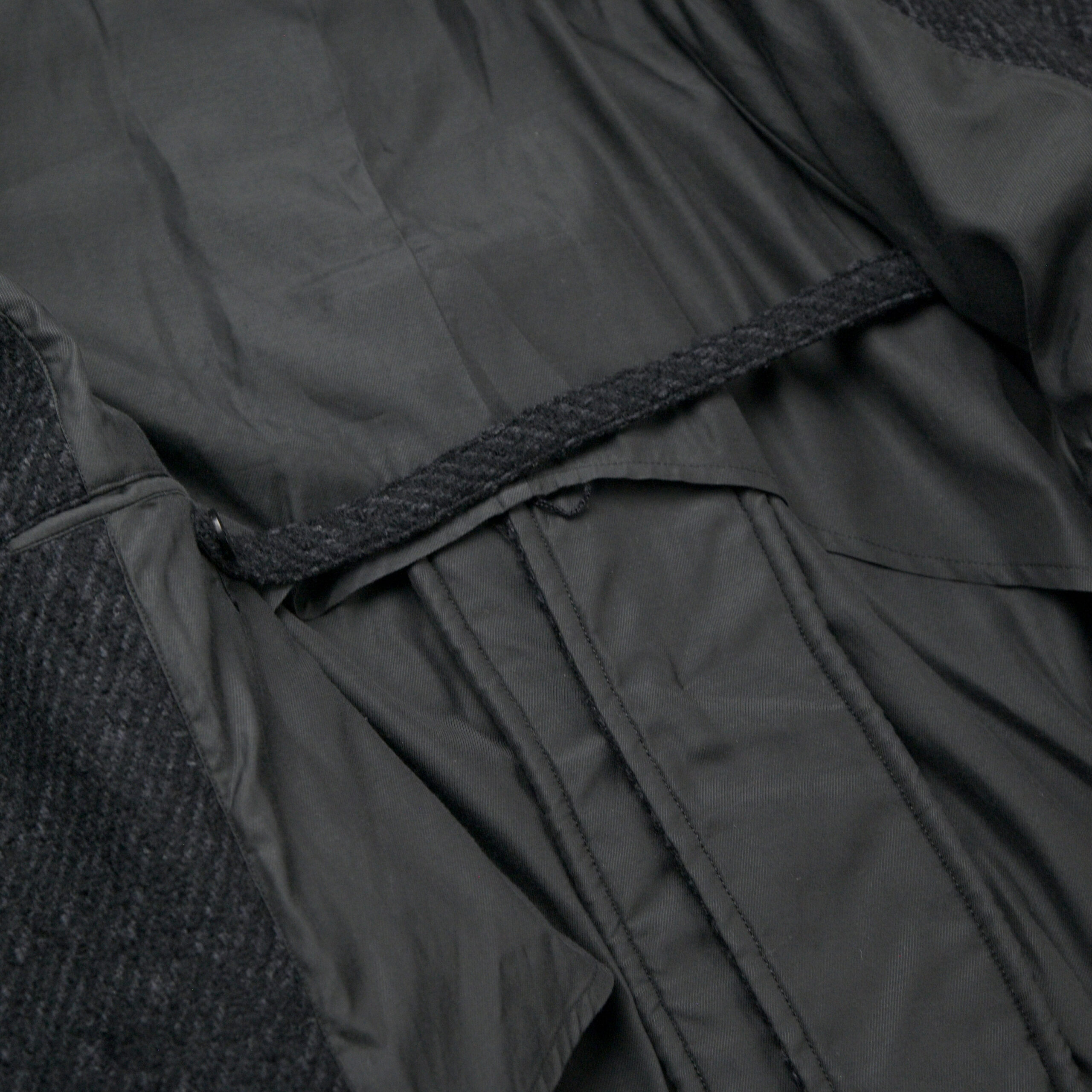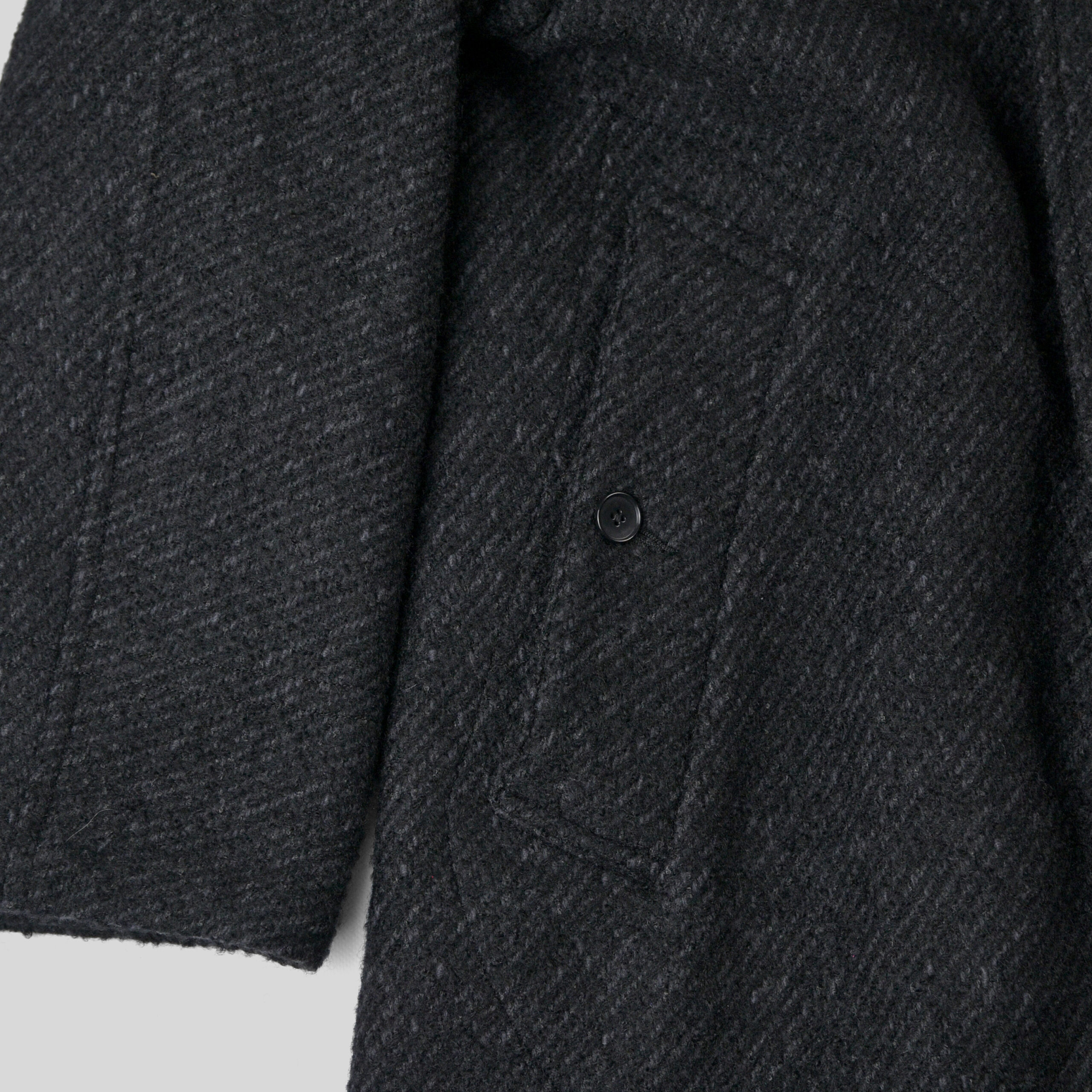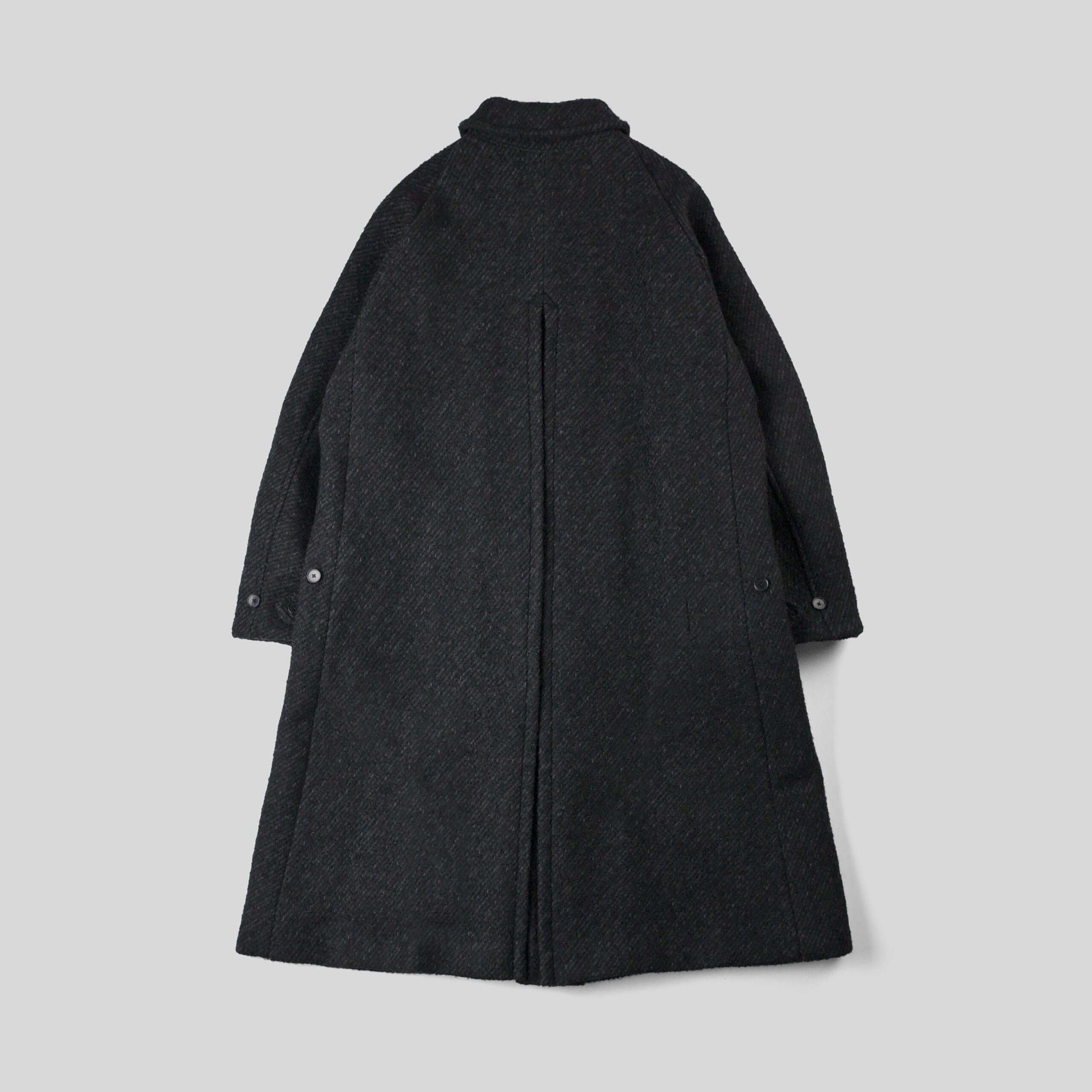 4種の糸で構成し織り上げている為、表面の凹凸感が他にない存在感を醸し出します。凛々しい表情に相反するかのように軽やかな羽織り心地を持つ。動く度に布が綺麗に舞うようにと、マテリアルのウエイトにまでOLDJOEの意匠設計を垣間見ることができます。