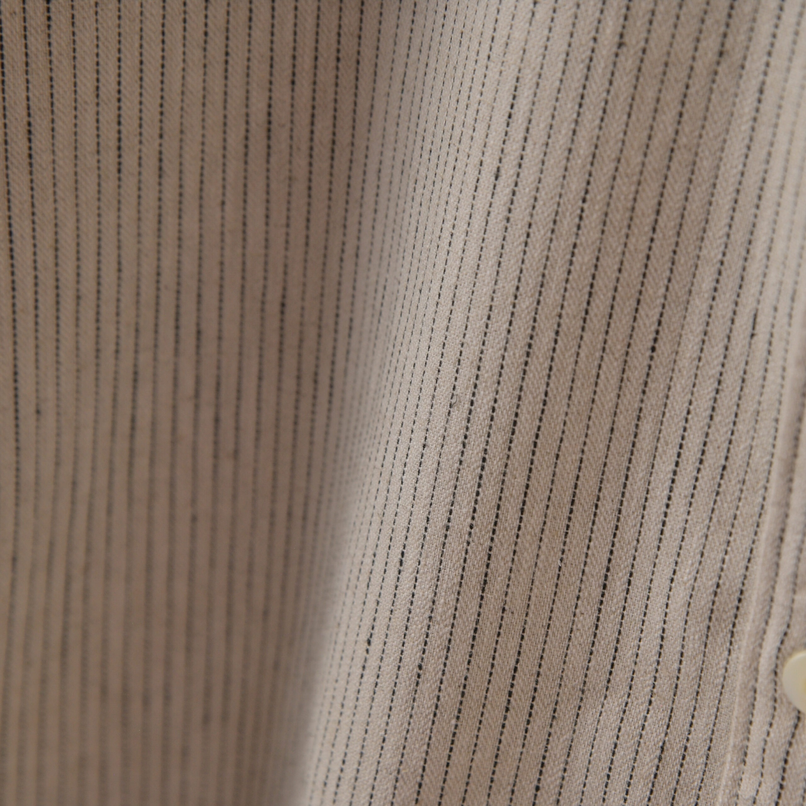 生地は綿麻の混毛糸を使用した先染めシャツ地。生地に洗いをかけることによりハリ感とドライタッチな風合いが特徴。ナチュナルな節とムラ感のある素材です。