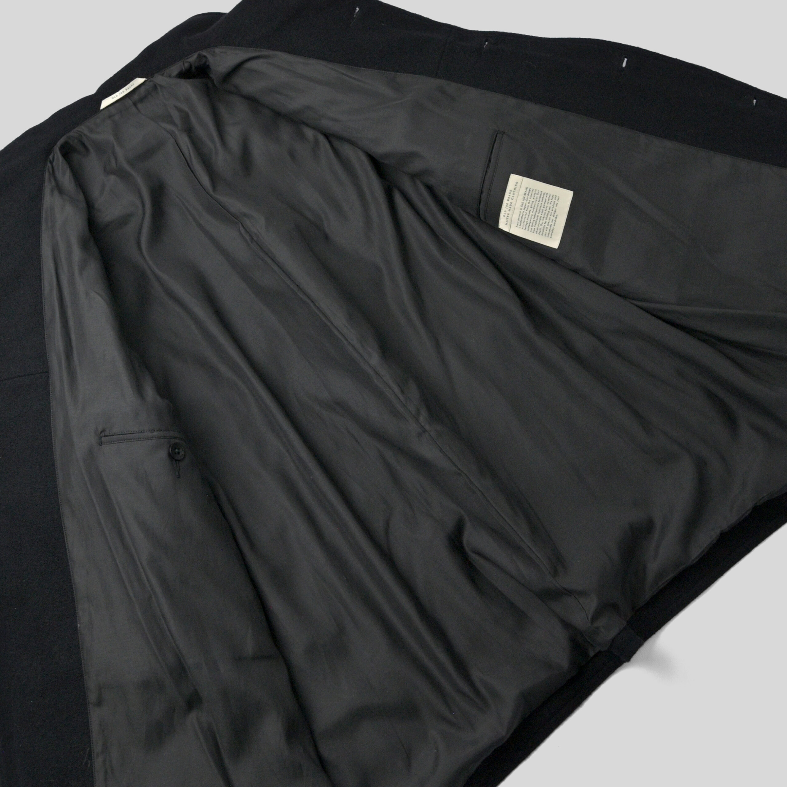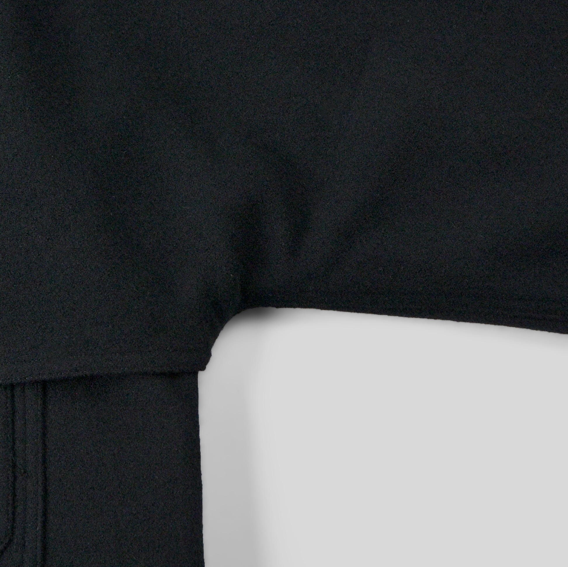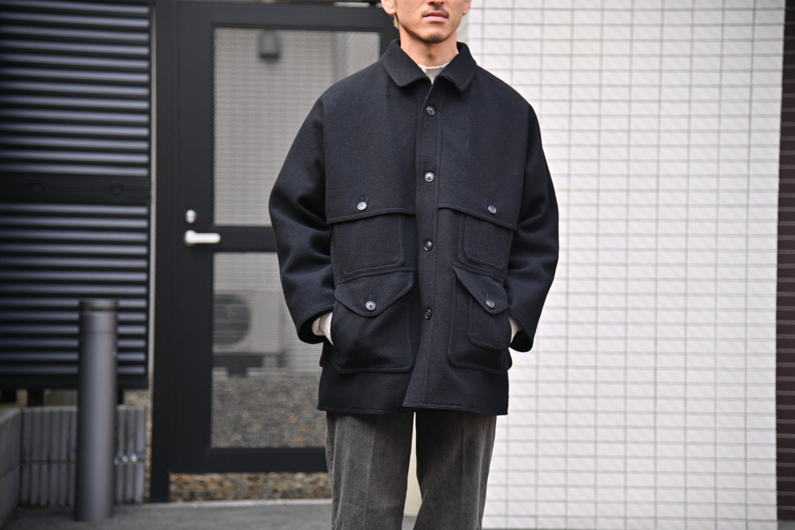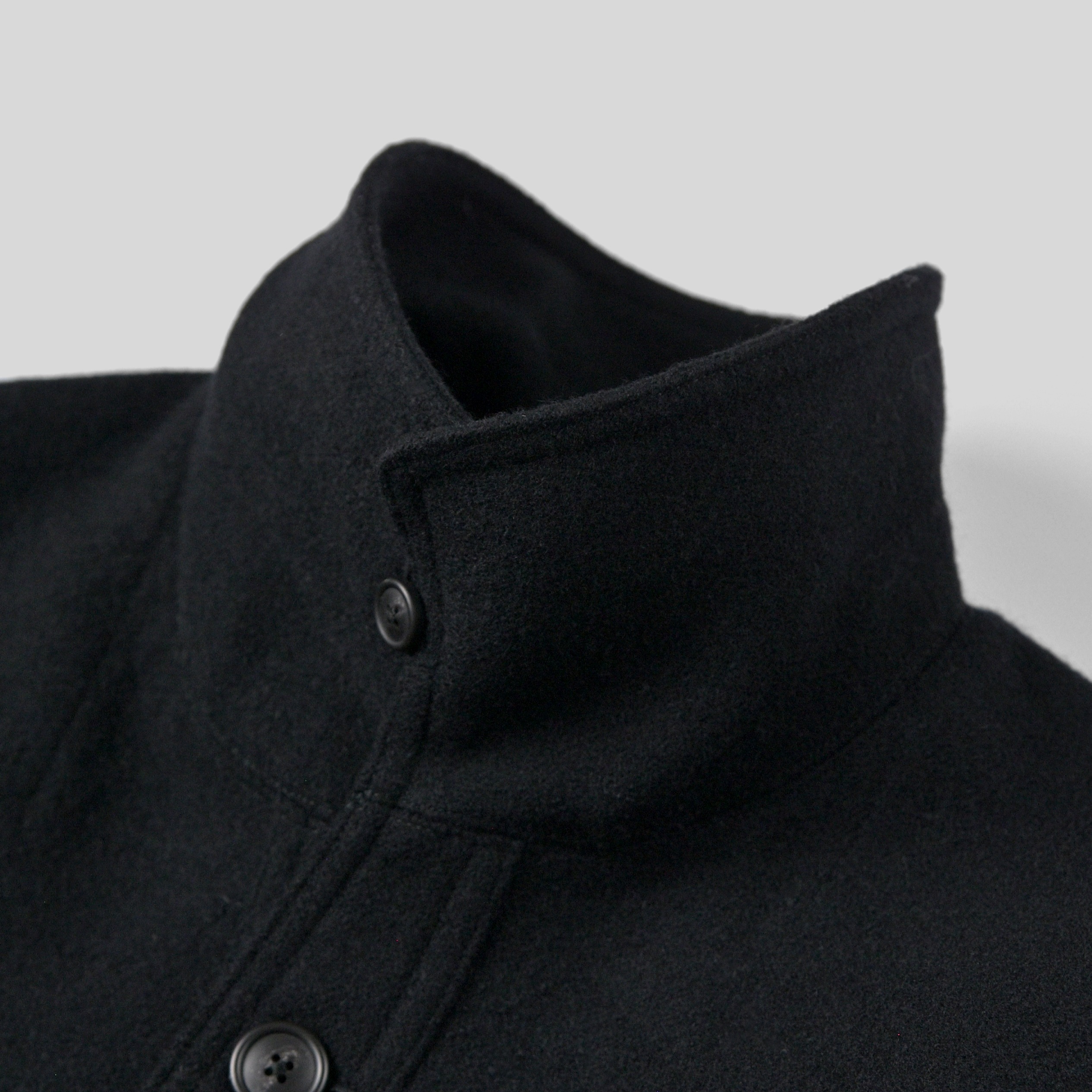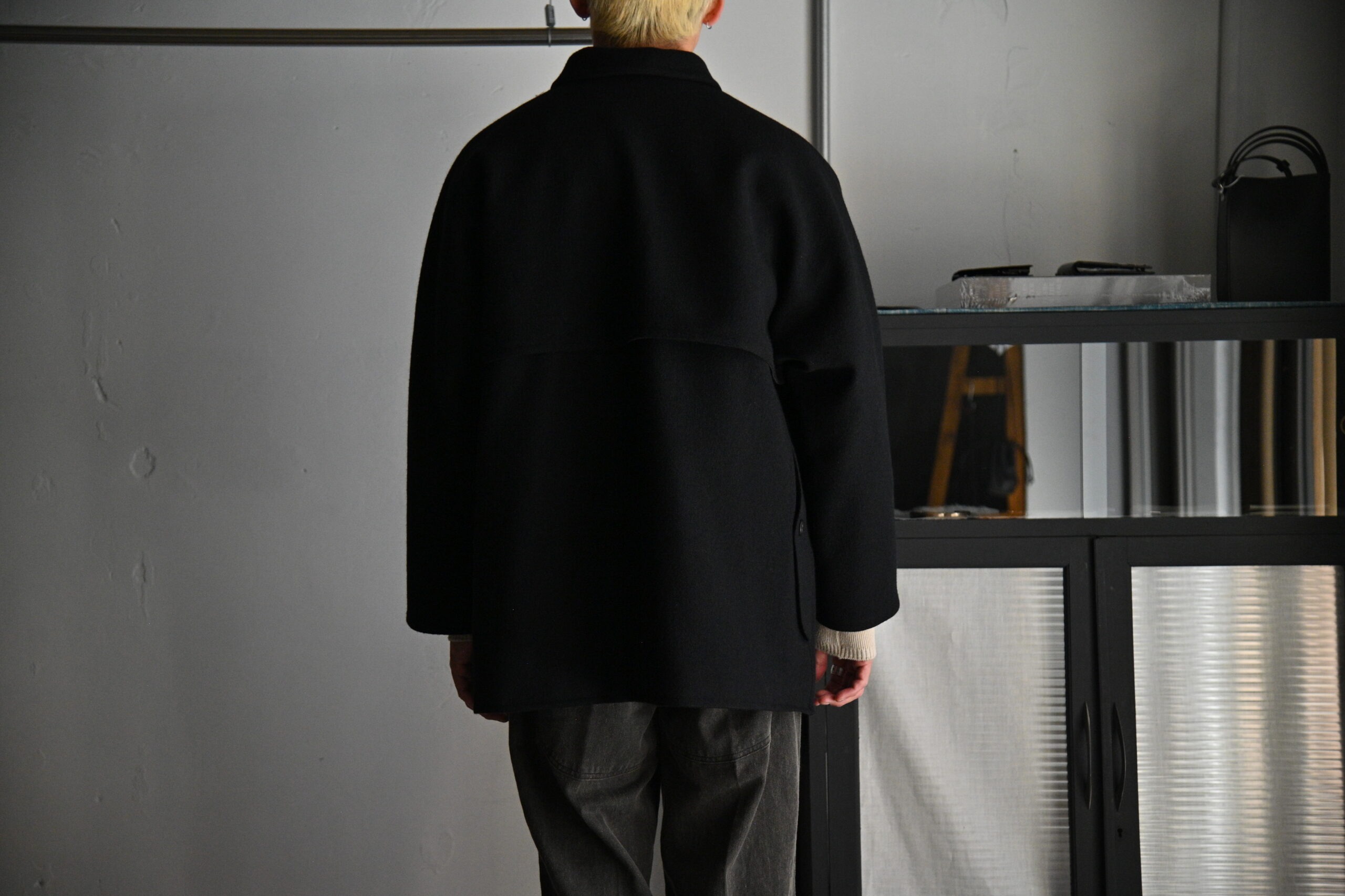 また襟はボタンを備えているので、スタンドカラーとしての側面も併せ持っています。ブークレーヤーンを用いて織り上げたメルトンは不均一かつモダンな表情を持っており都市生活者のためのコンフォタブルなフィッティングラインは、アーカイブピースの持つそれとは別物でとても品の良い佇まいを見せる。