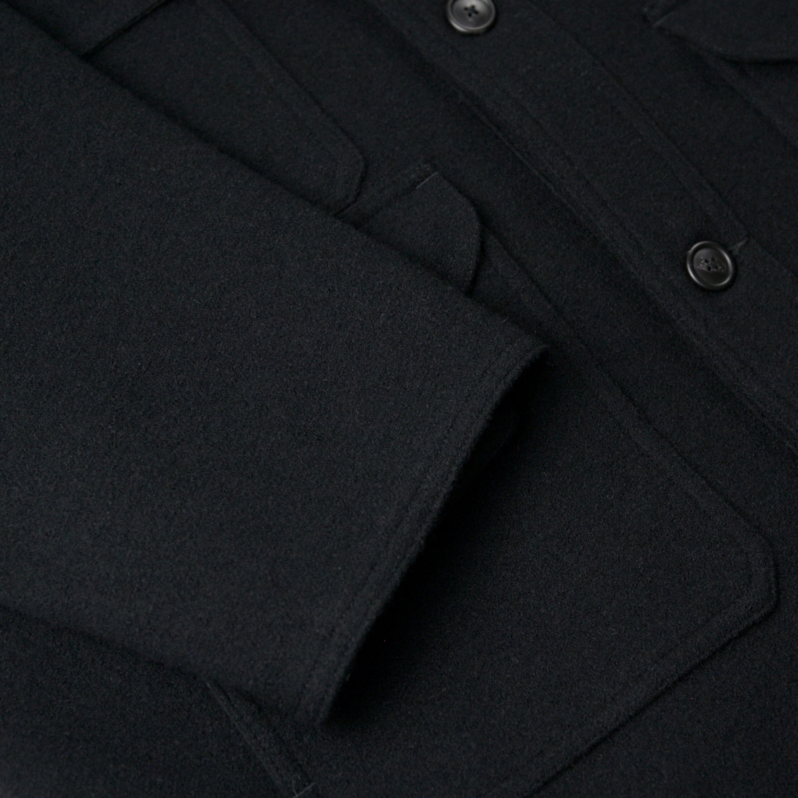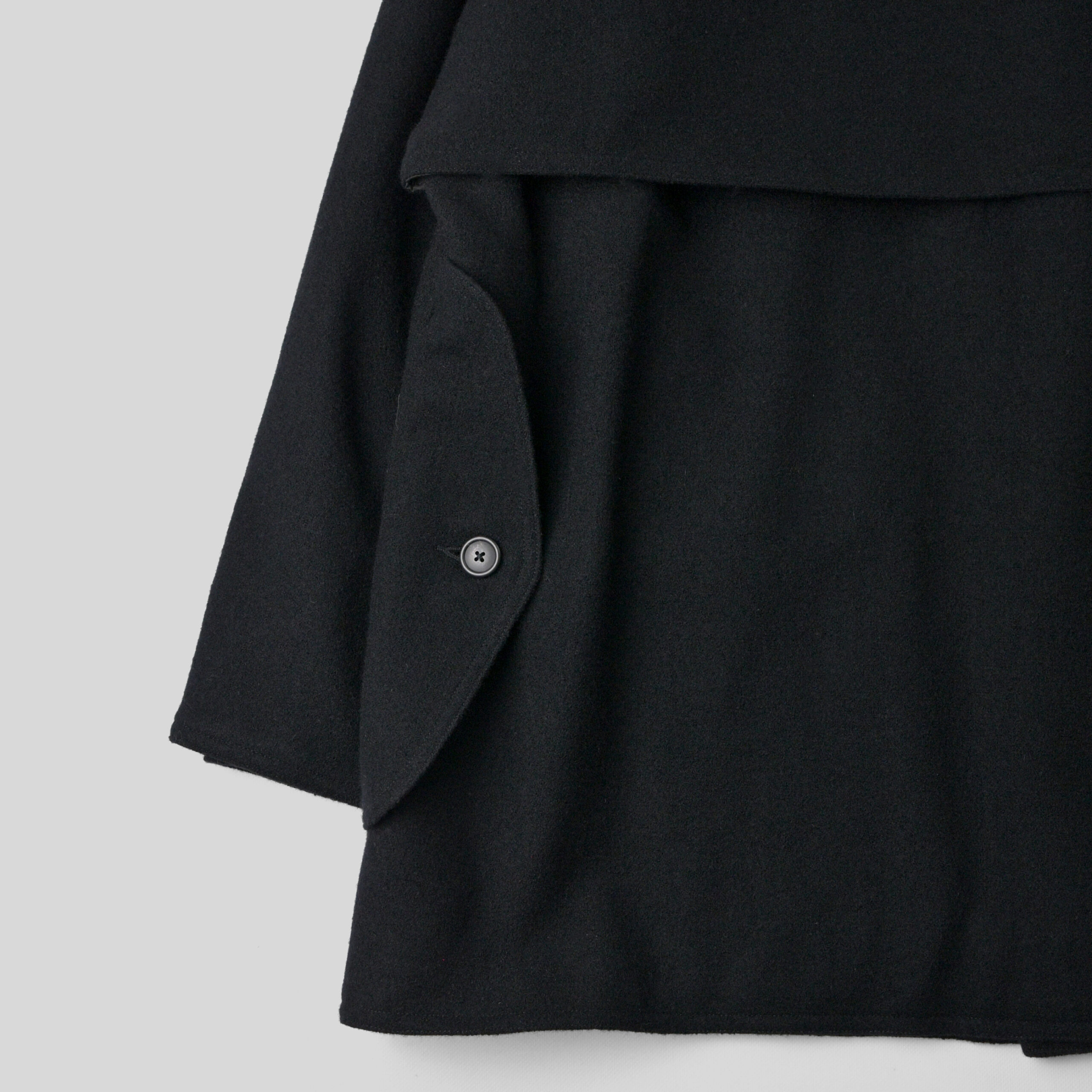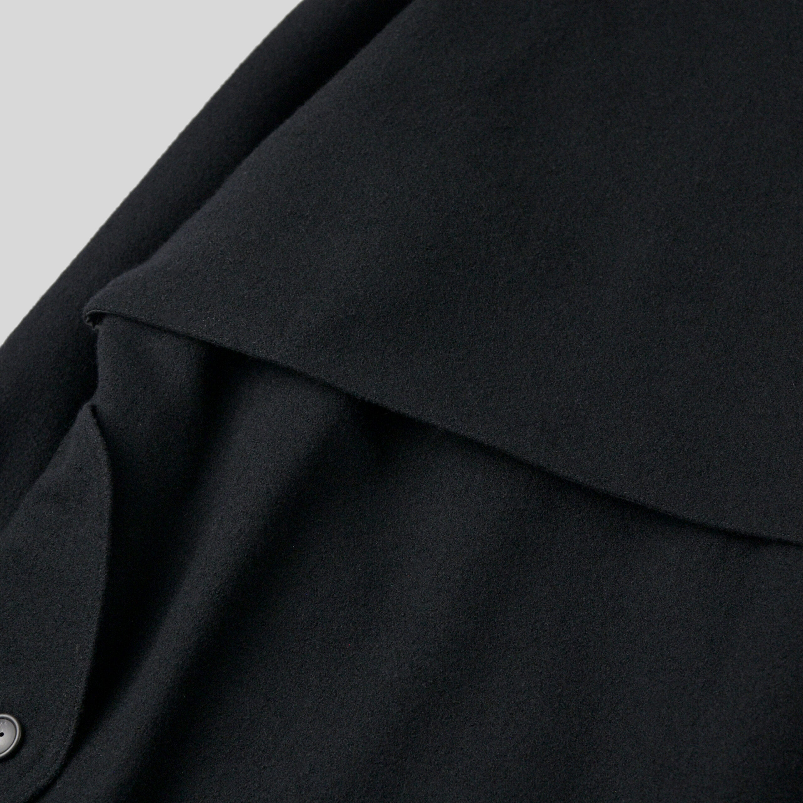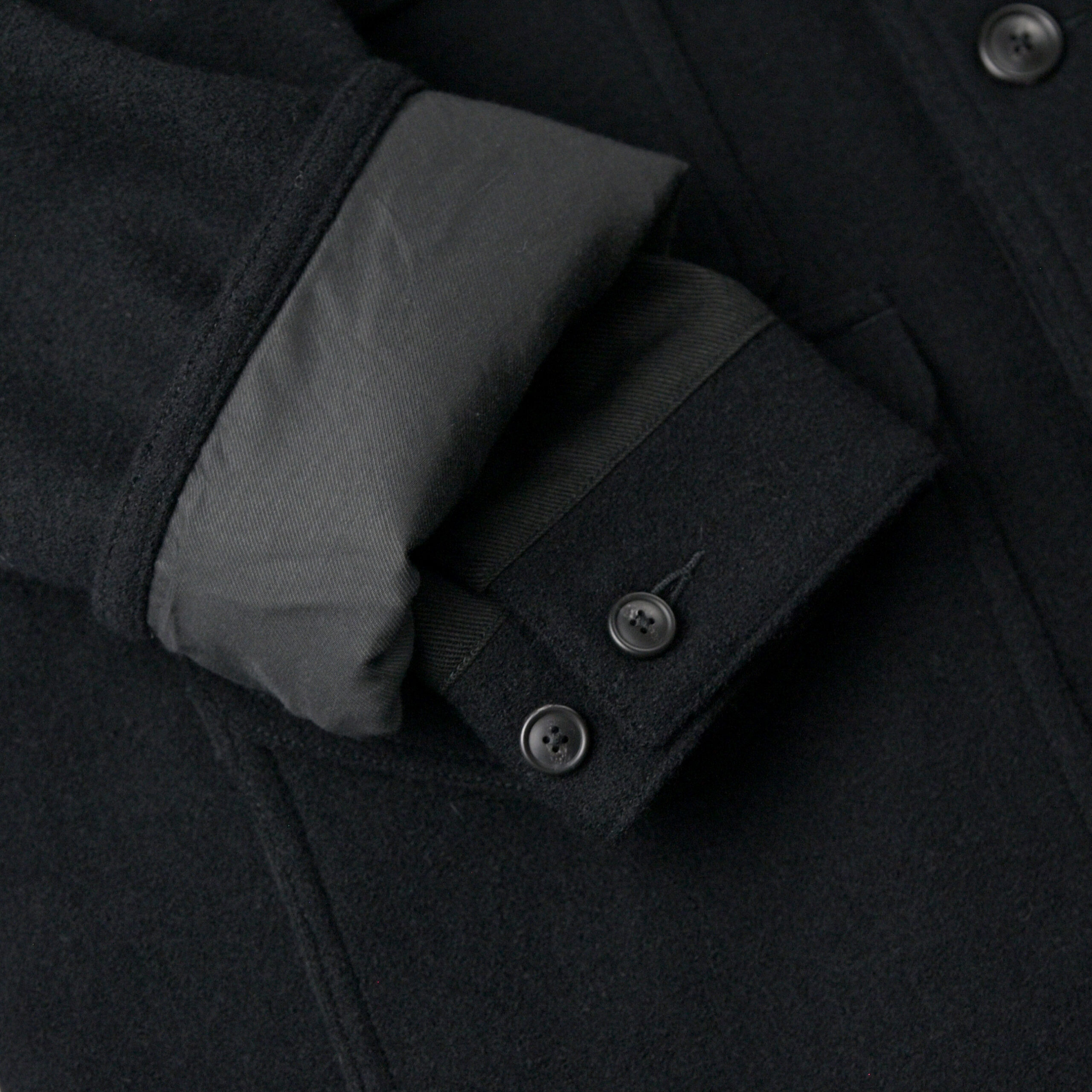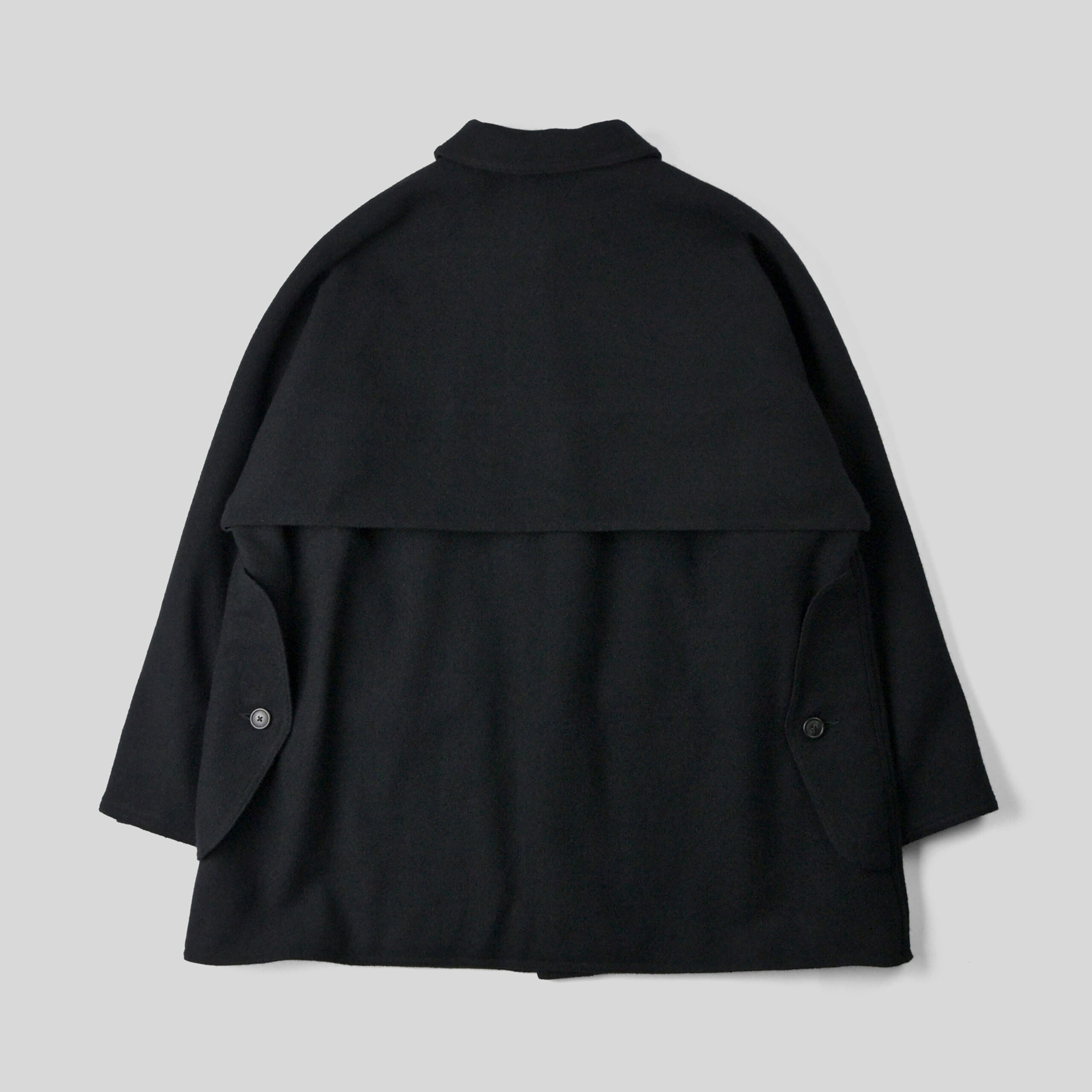 また襟はボタンを備えているので、スタンドカラーとしての側面も併せ持っています。ブークレーヤーンを用いて織り上げたメルトンは不均一かつモダンな表情を持っており都市生活者のためのコンフォタブルなフィッティングラインは、アーカイブピースの持つそれとは別物でとても品の良い佇まいを見せる。