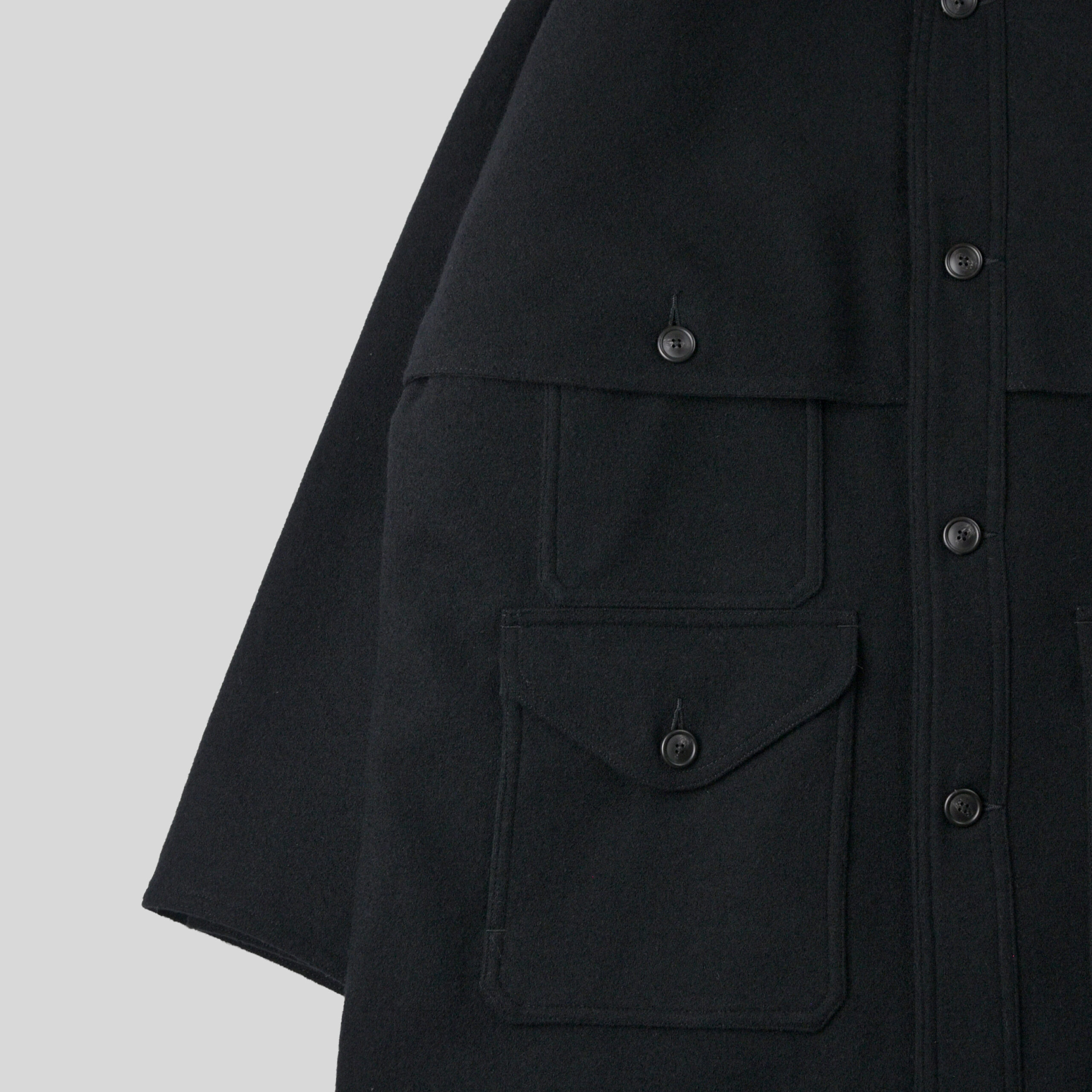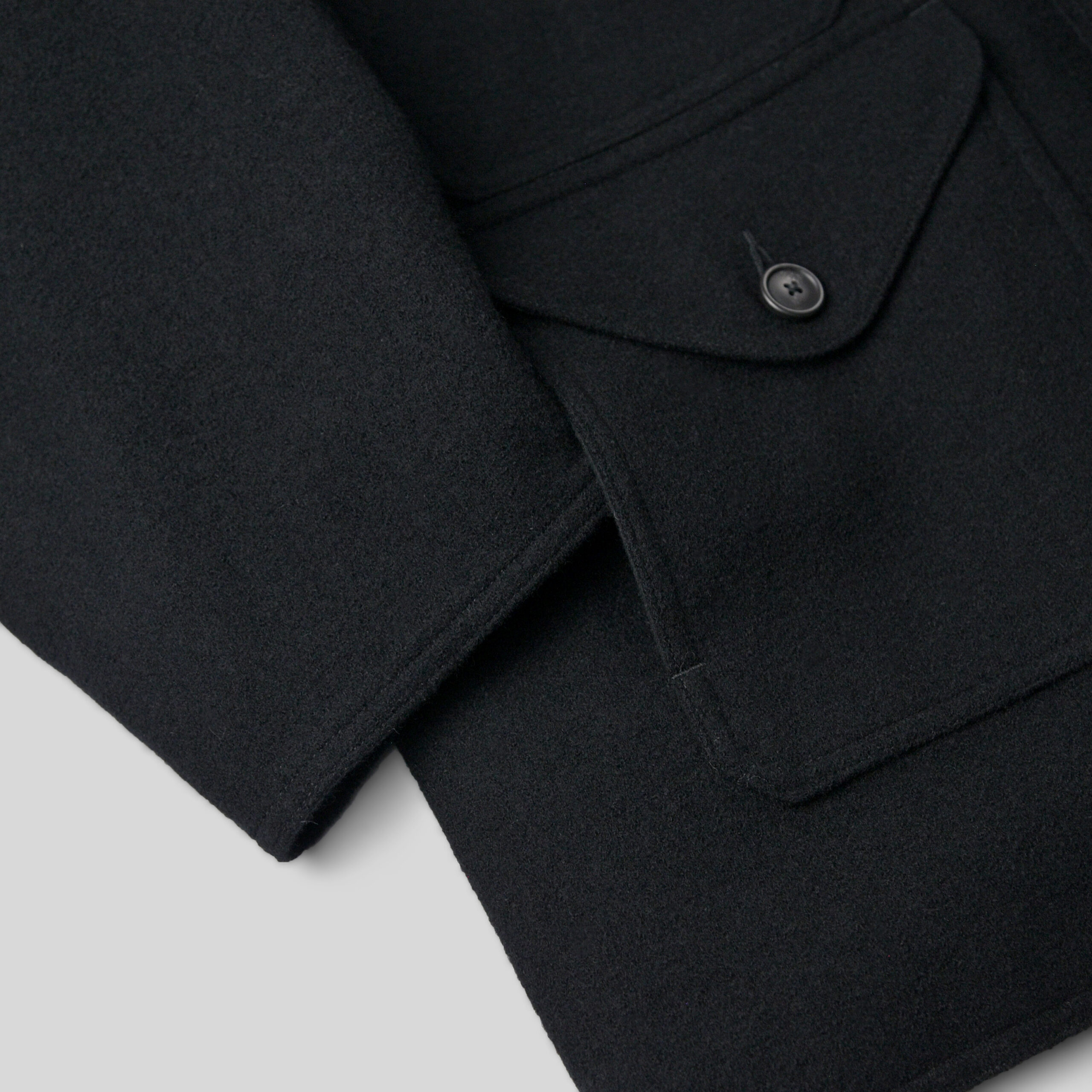 ハンティングウェアの代表的なデザインであるダブルヨーク&スリーブ、ゲームポケットを配し、見返しから弧を描くように設計された小振りなワンピースカラーが美しい。
