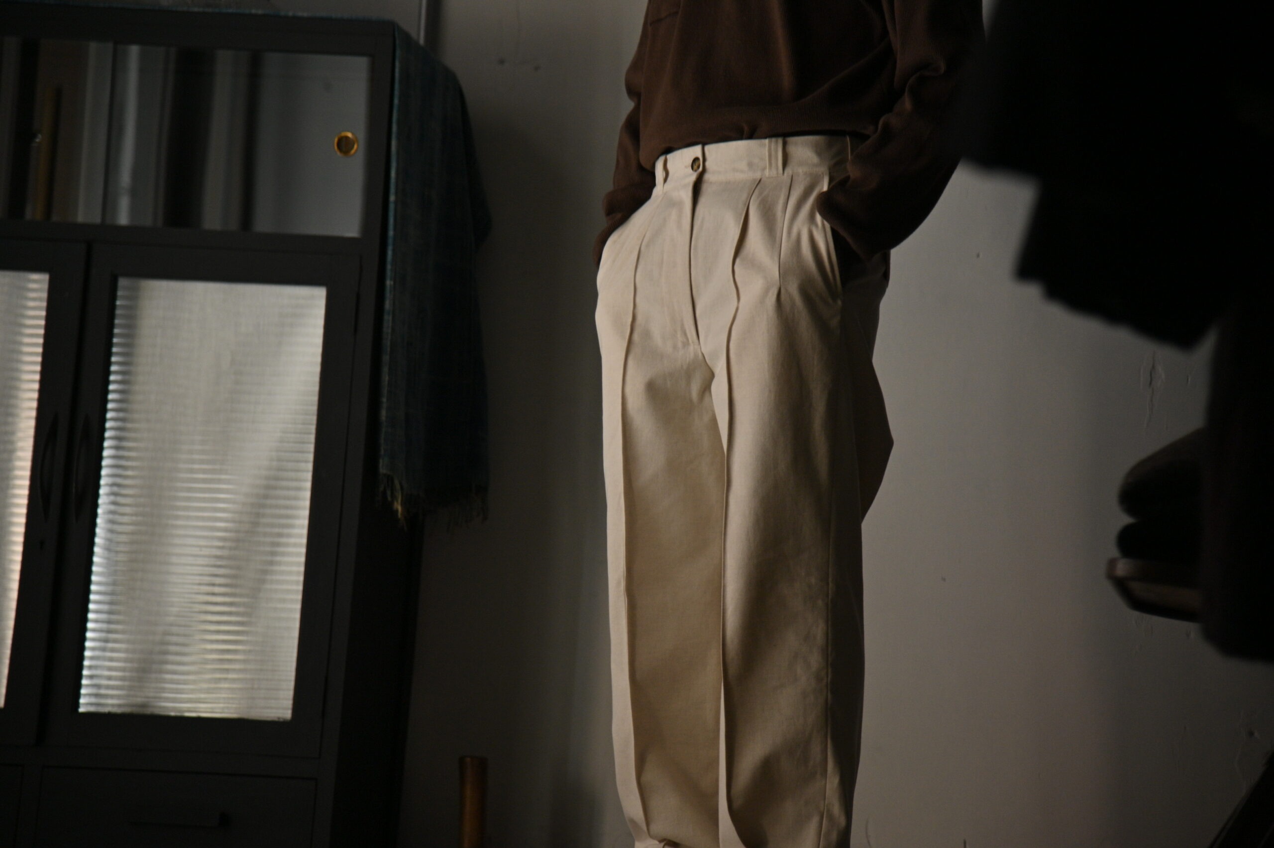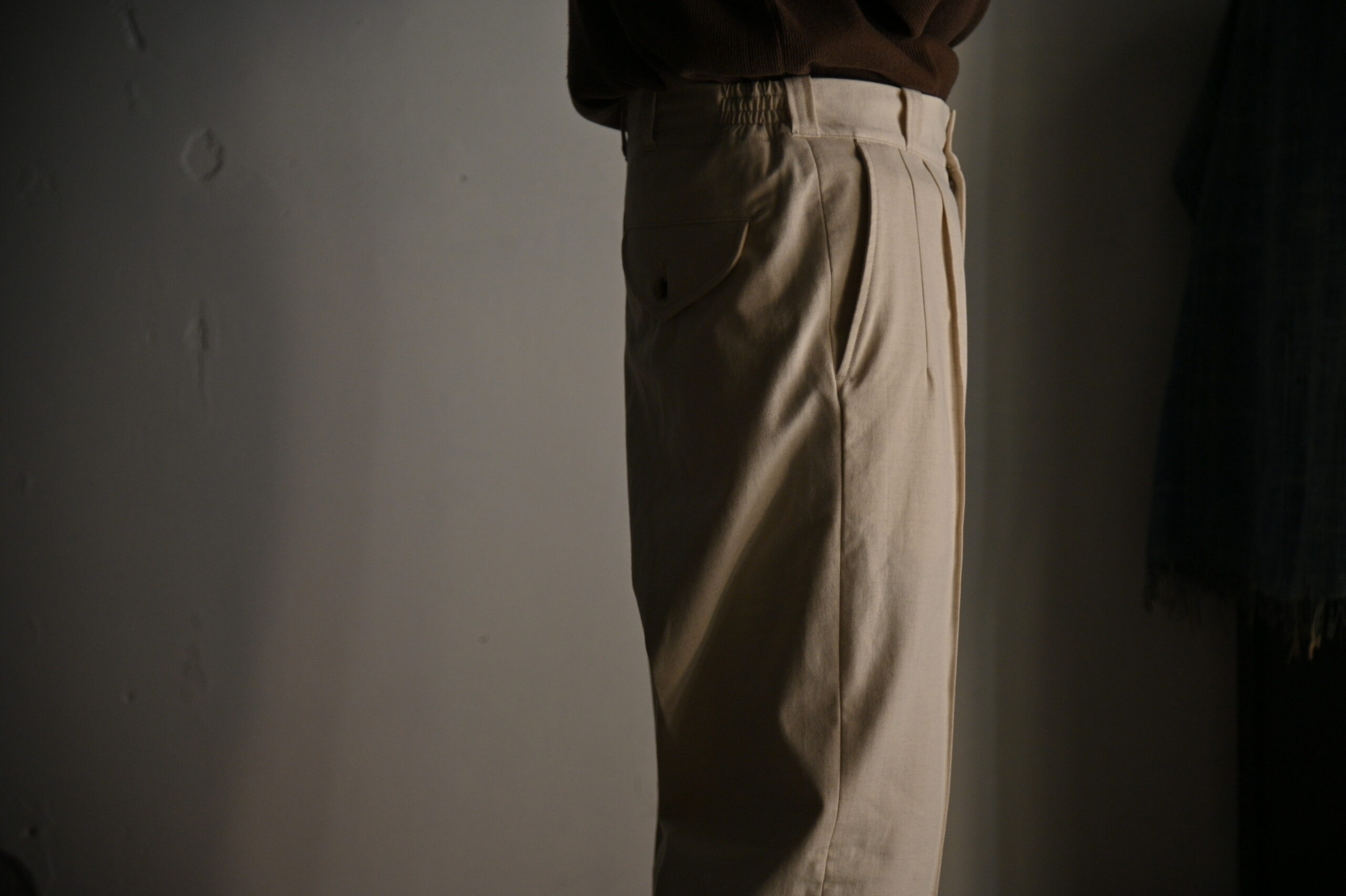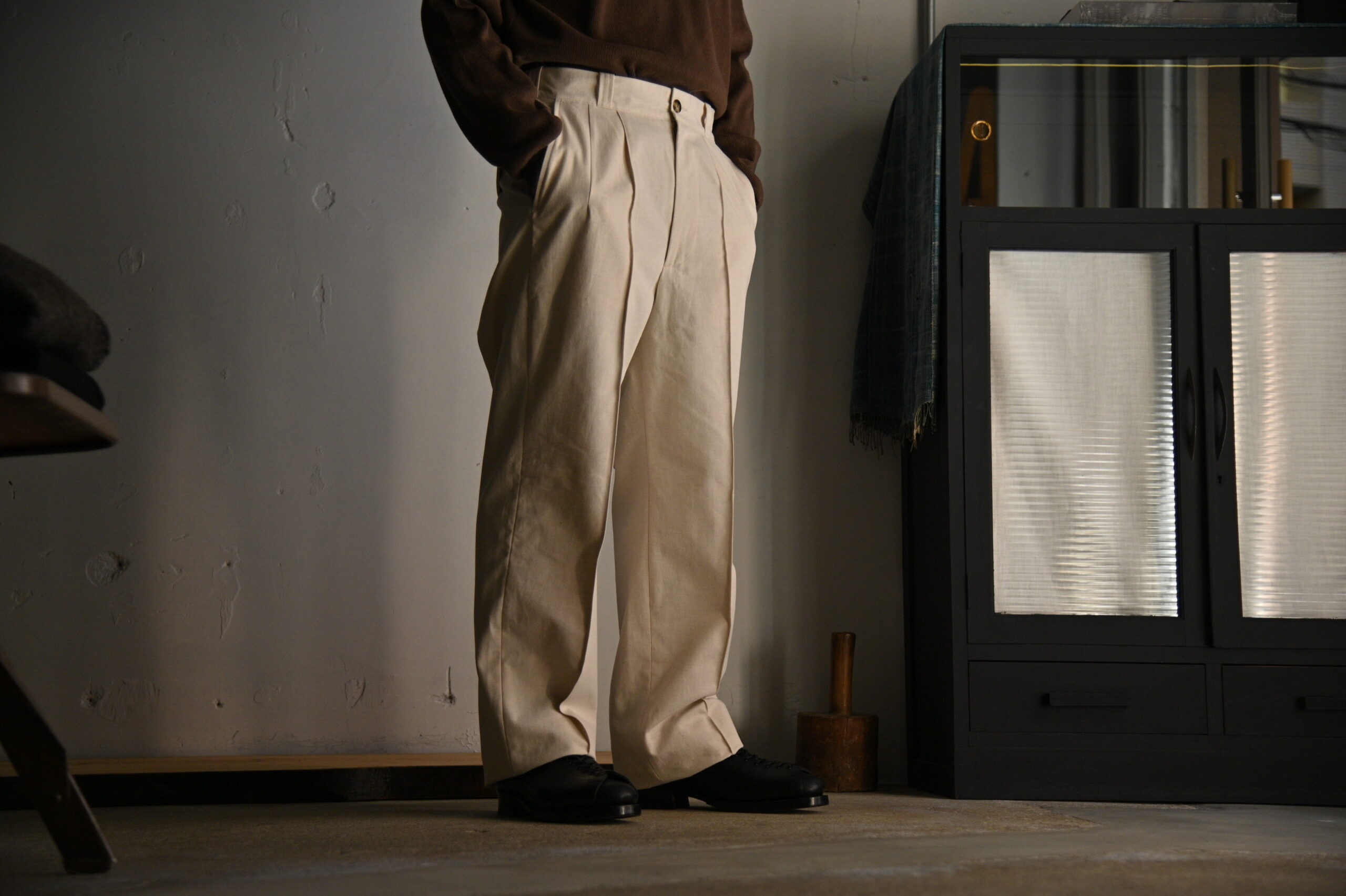 インスピレーションは、ミッドセンチュリー期のミリタリーアーカイブデザインとなり、簡素なデザインの中に 一際目立つディテールのピンタックに、サイドウエストに配されたエラスティックバンドなどの心くすぐられる古き良き 意匠が垣間見れます。