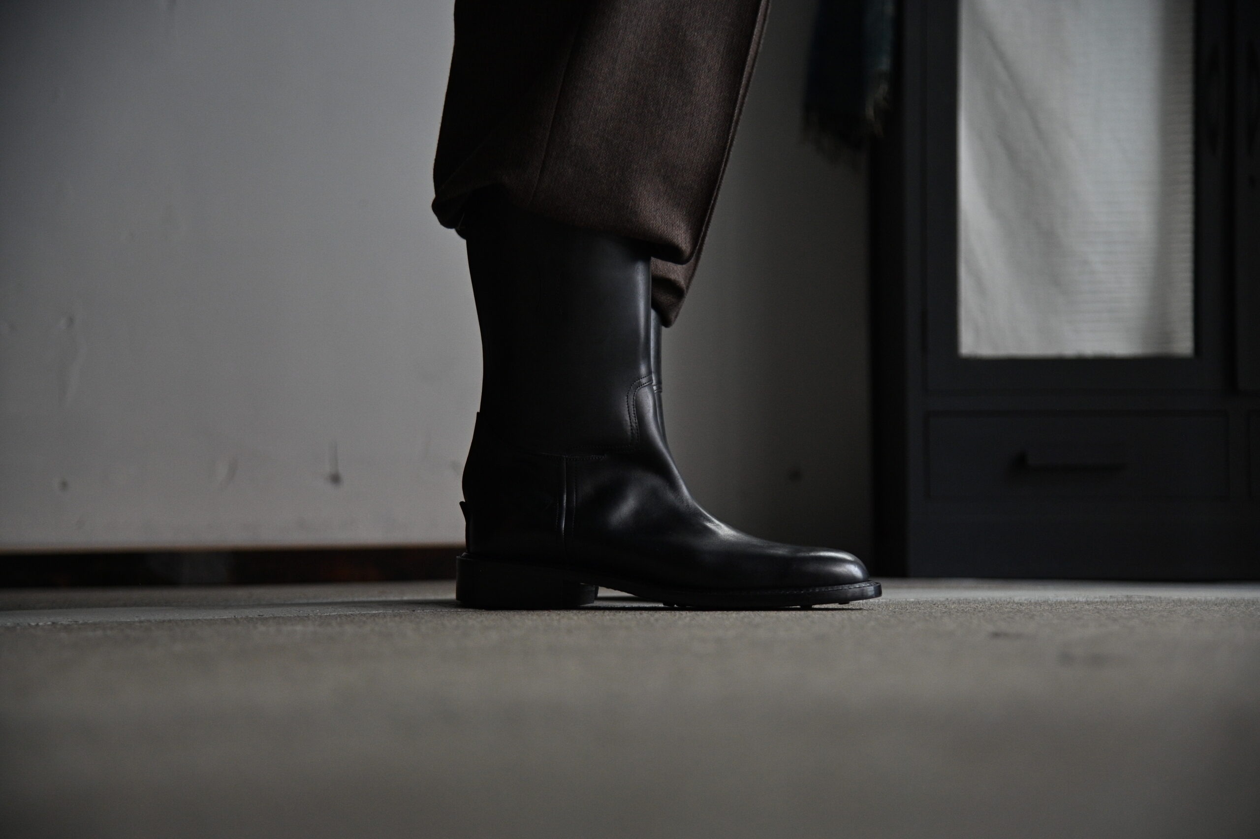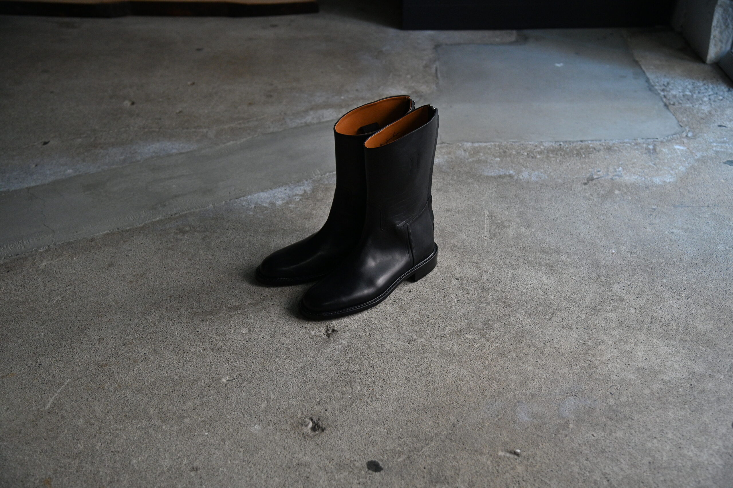 エンジニアブーツのプロトタイプとされているホースライディングブーツは、デザインはそのままにマテリアルを置き換え、現代でもレインブーツとしても活躍してくるタイムレスな佇まいを持っています。 アメリカンなエンジニアブーツ、ペコスブーツに対し、ジェンツなイメージを持つライディングブーツ。 構える事なく、気をてらう事なく履いてもらうのがベストでしょう。