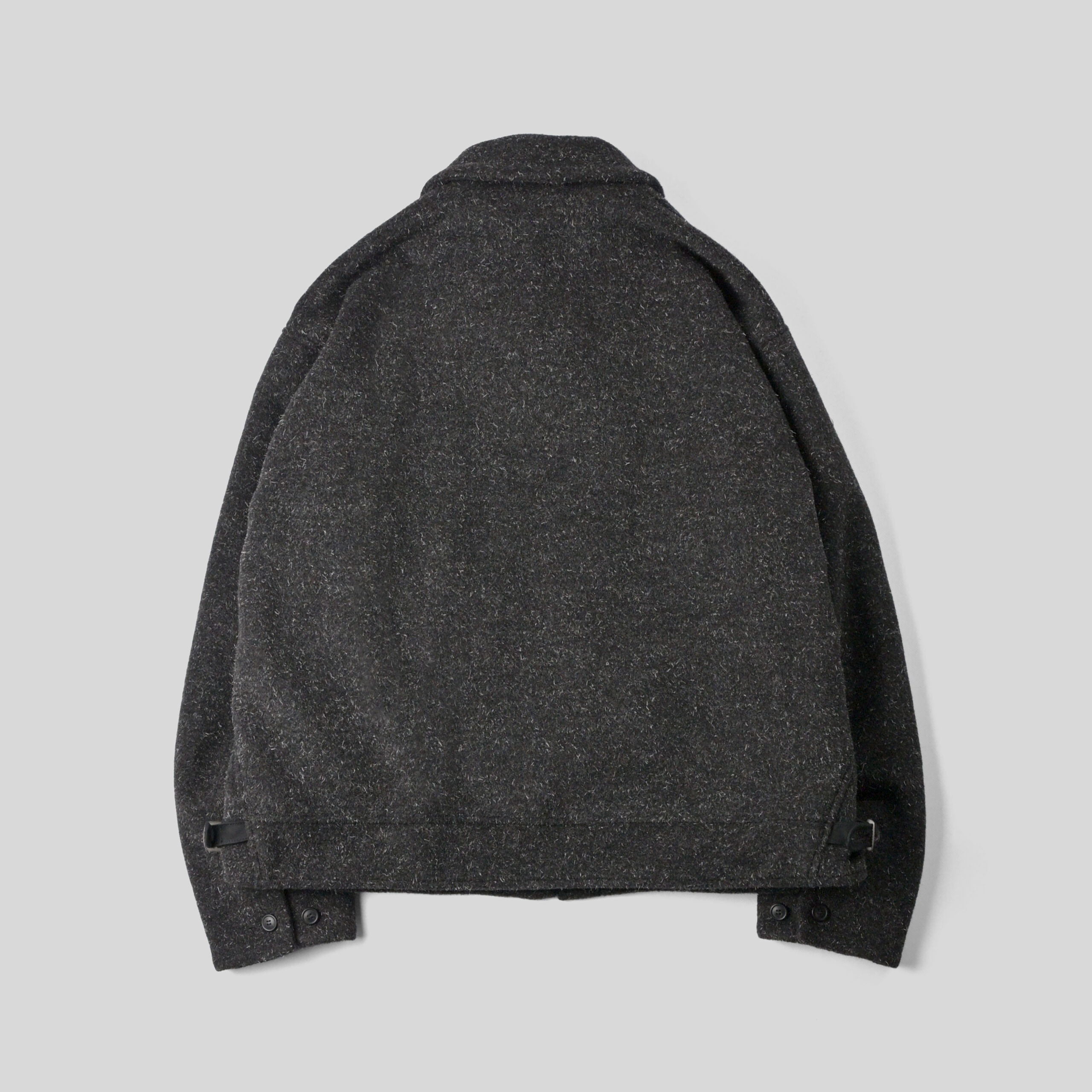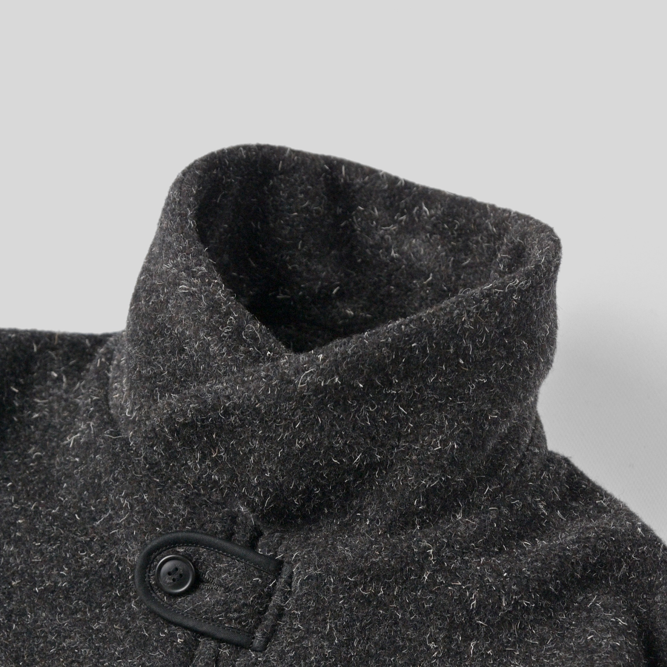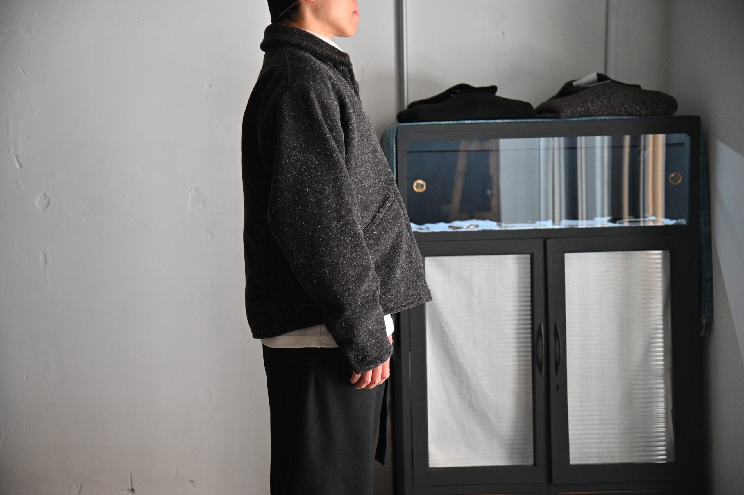 前見頃に配したポケットと弧を描くスレキステッチ、静かに装備される首元のボタンループ、袋縫いで設計された襟など古き良きディテールとモダンな空気感が共存しています。多色使いで織り上げたケンピモッサからは他にはない色味の深さ、独特なタッチ感を感じれるでしょう。