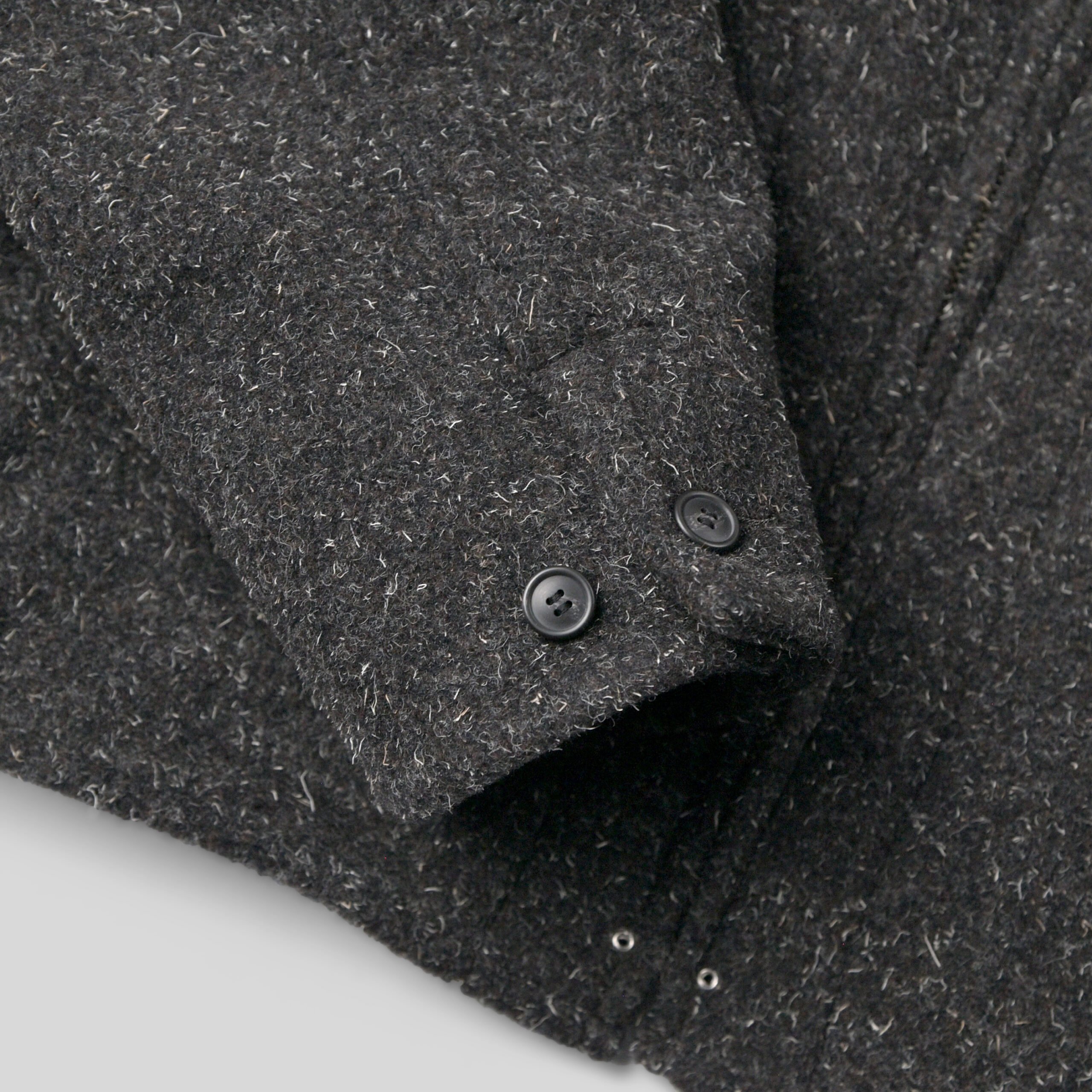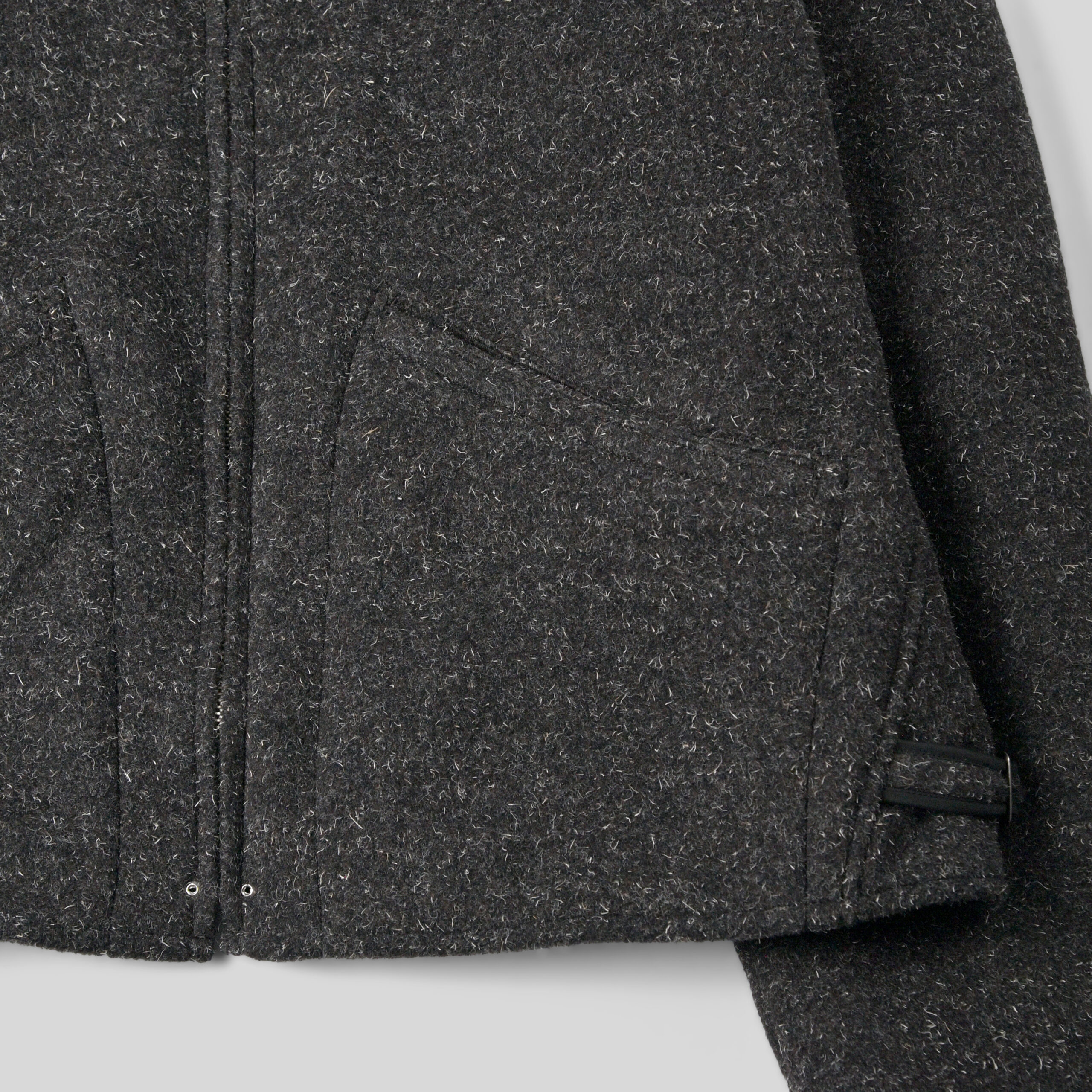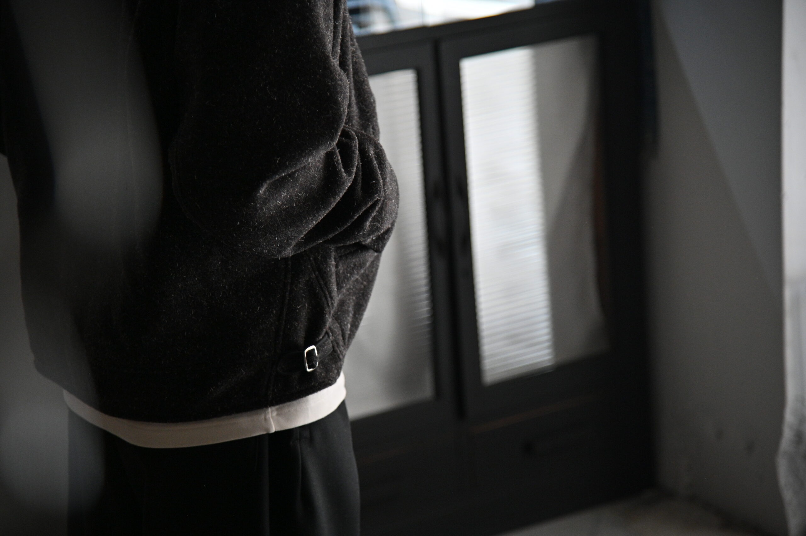 前見頃に配したポケットと弧を描くスレキステッチ、静かに装備される首元のボタンループ、袋縫いで設計された襟など古き良きディテールとモダンな空気感が共存しています。多色使いで織り上げたケンピモッサからは他にはない色味の深さ、独特なタッチ感を感じれるでしょう。