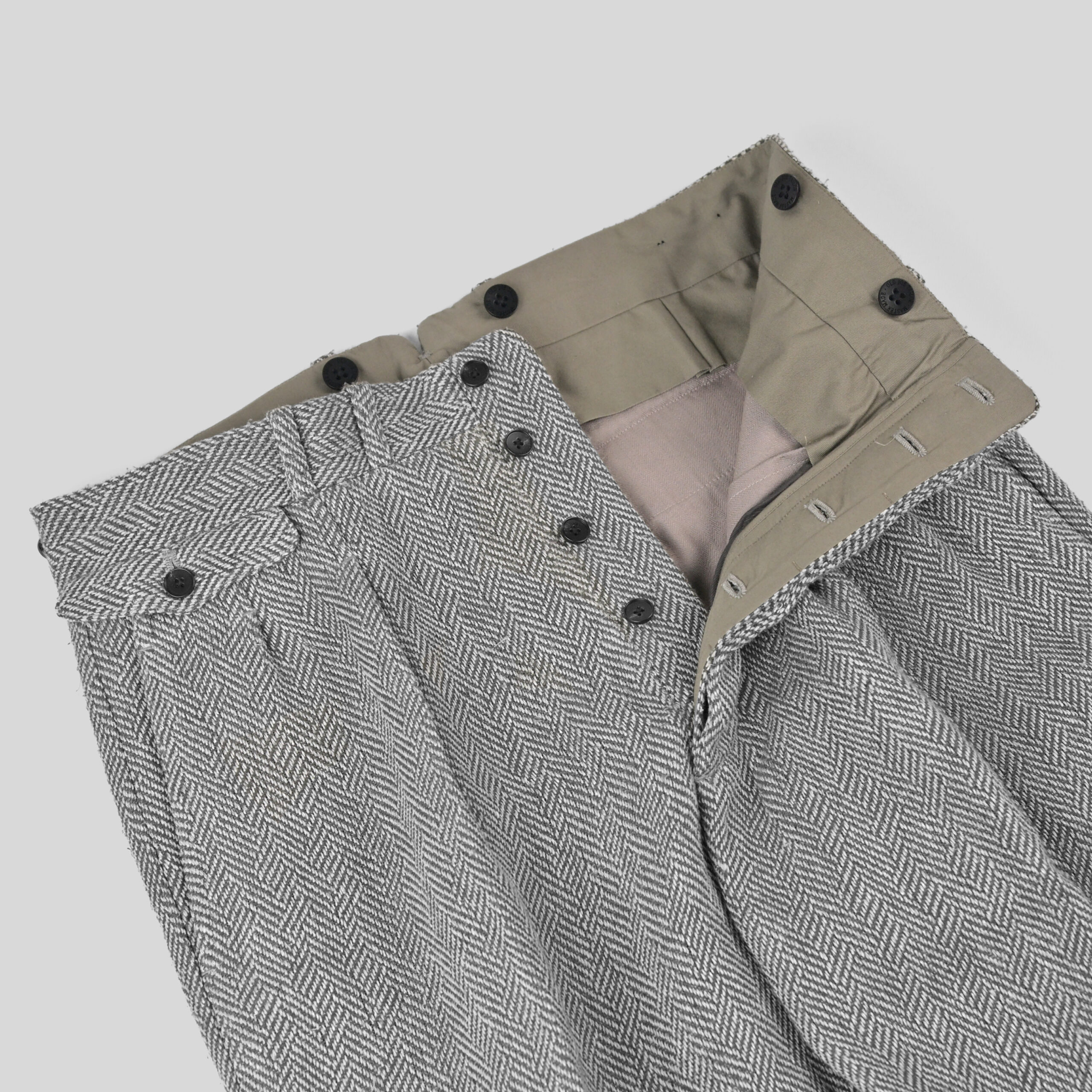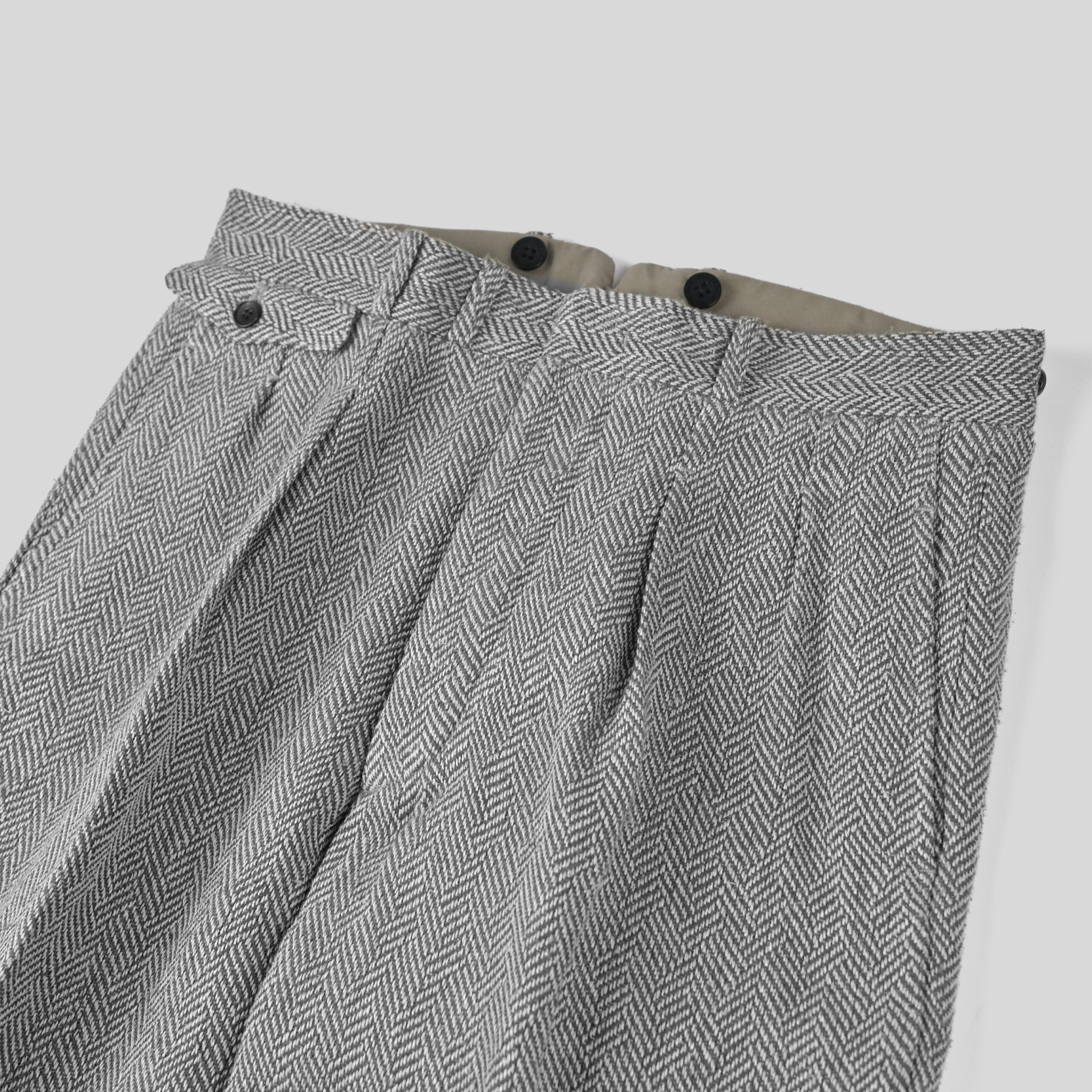 生地には フランス(ノルマンディー地方)の原料を使用したリネンと紬糸を交撚した別注糸を使用し、リネンTOP引き揃えに紬糸を撚り合わせることで、より深い表情感を演出。 組織はヘリンボーンの間に別組織をいれた「IRREGULAR HERRINGBONE 」と組織はヘリンボーンをあえて歪ませた「FANCY HERRINGBONE 」の完全オリジナルで、紬糸のネップ、リネンの糸節といった天然素材ゆえの不均一性が程度な意匠効果を醸し出す。