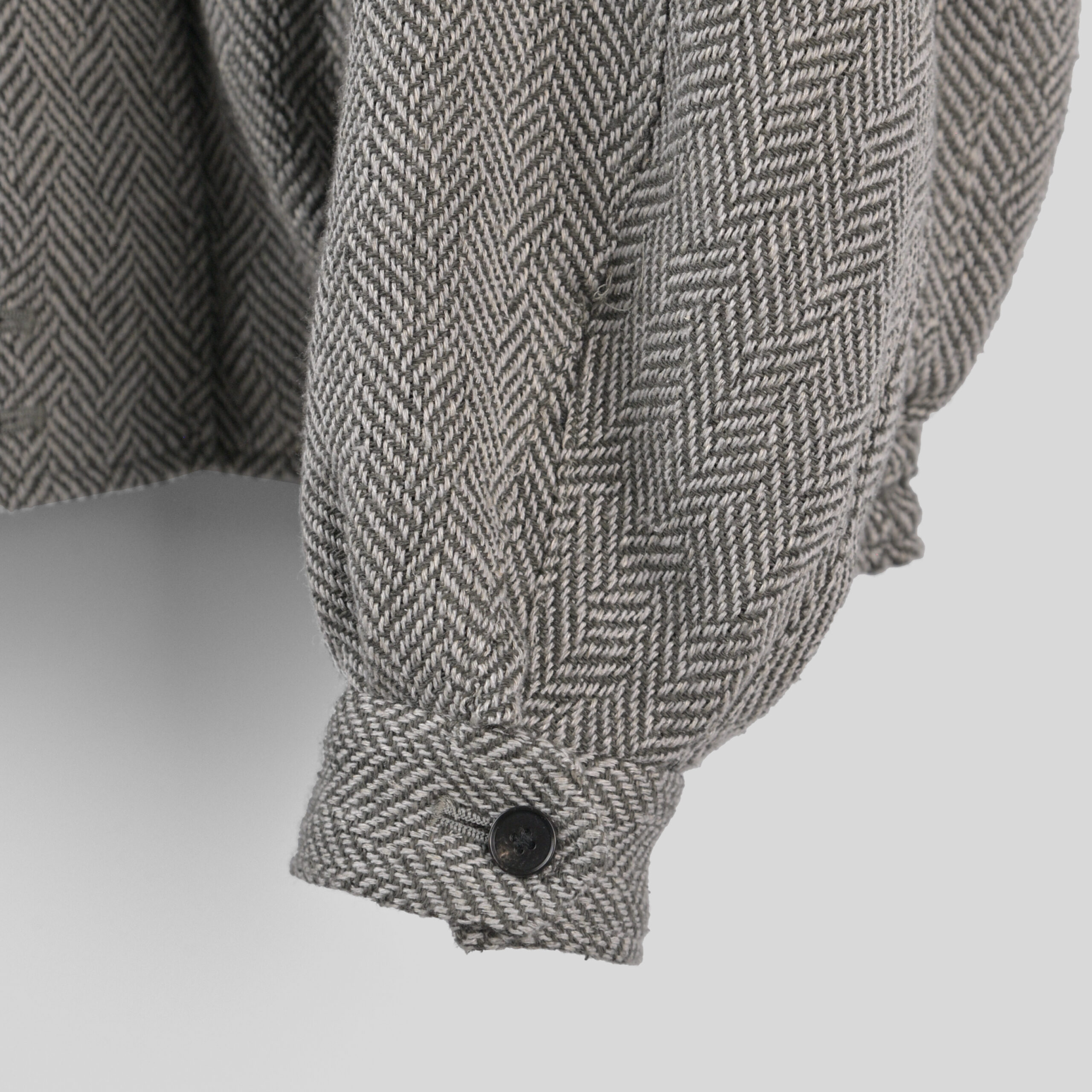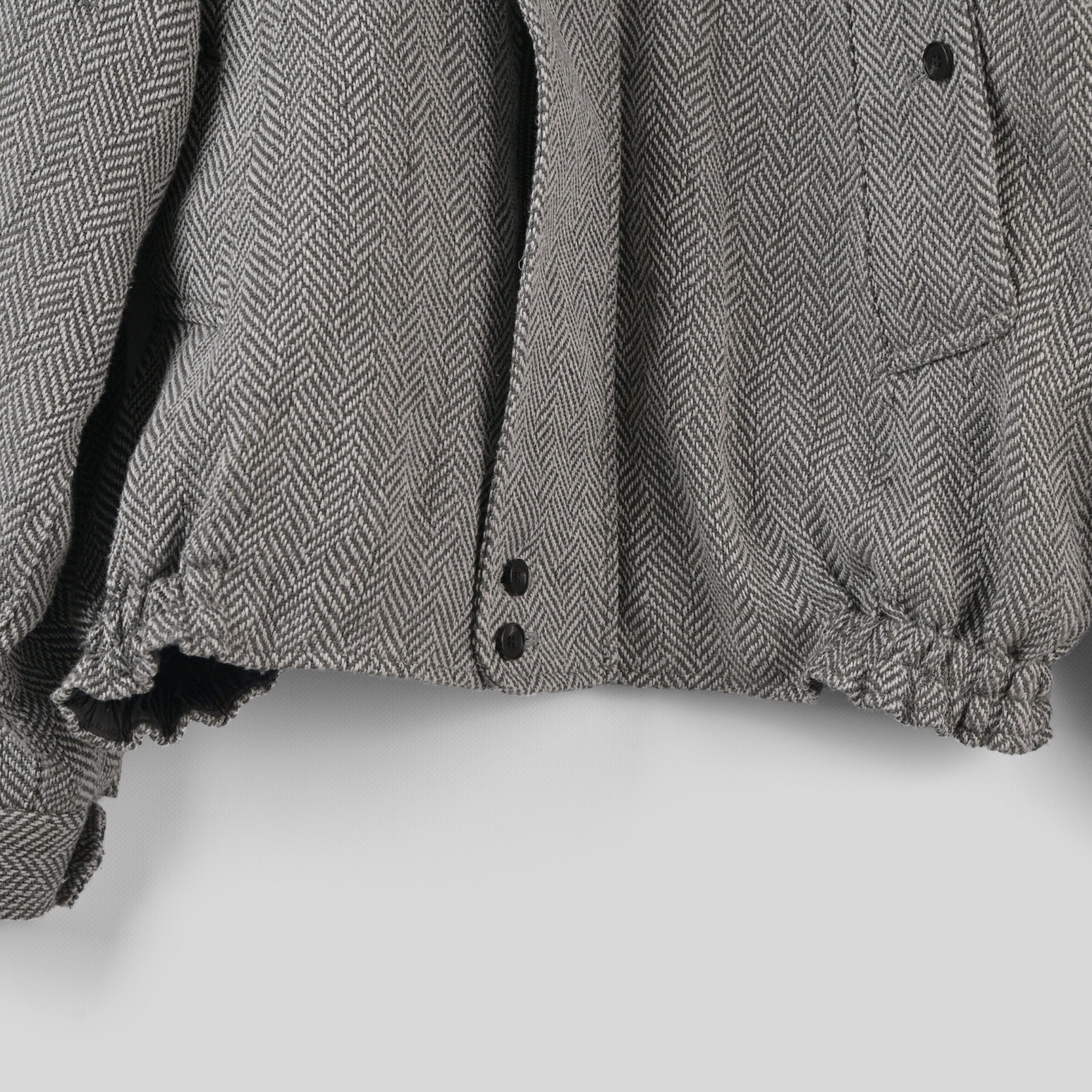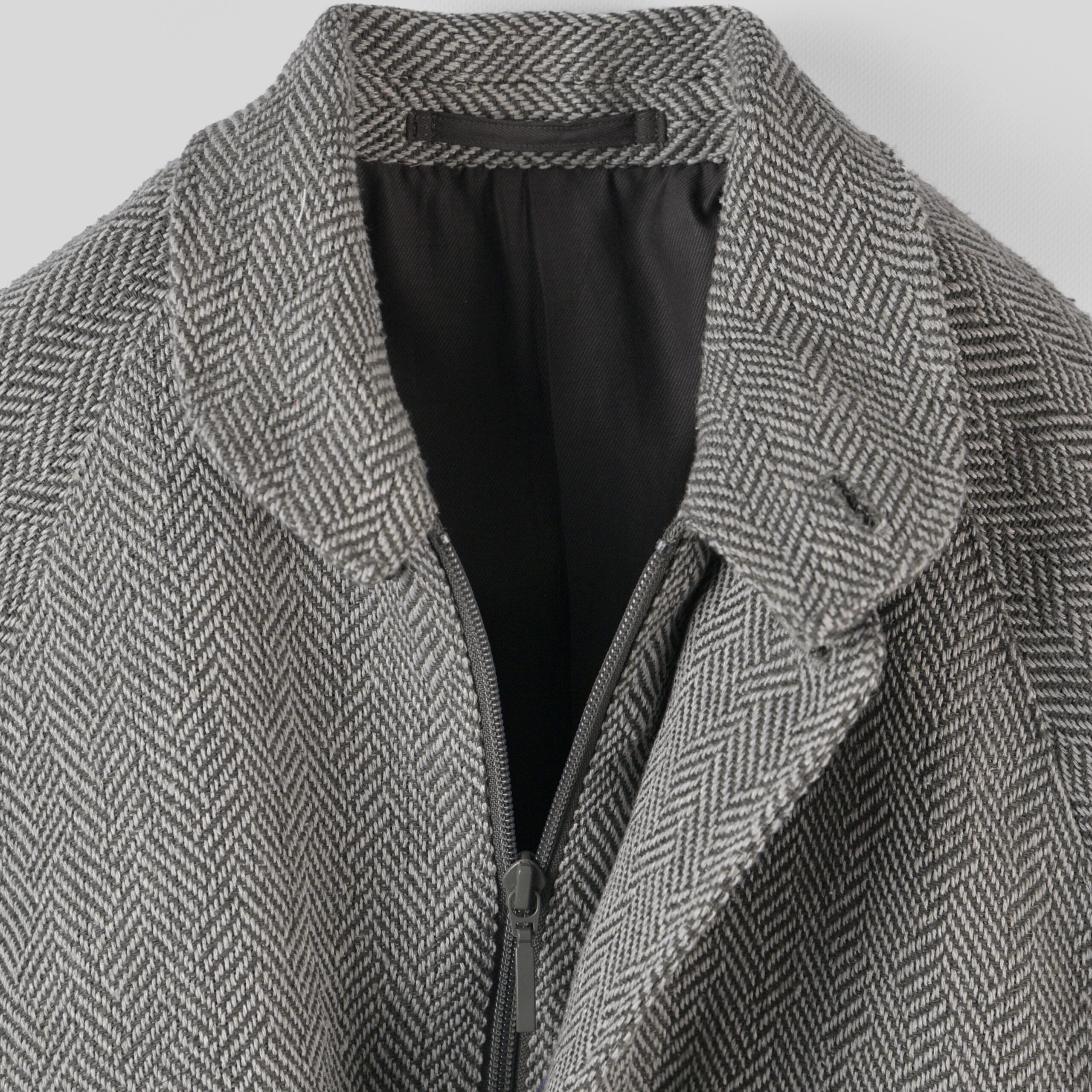 新型となるハリントンタイプのショートジャケット。 埃除け用でデザインされたユニークな襟、大きくゆとりを入れたスリーブラインと袖下のマチ、ライニングに直にアクセスできるポケットなど、古き良き意匠設計が盛り込まれた。 またオリジナルの企画で織り上げたサマーツイードは奥行きのある雰囲気を醸し出す。