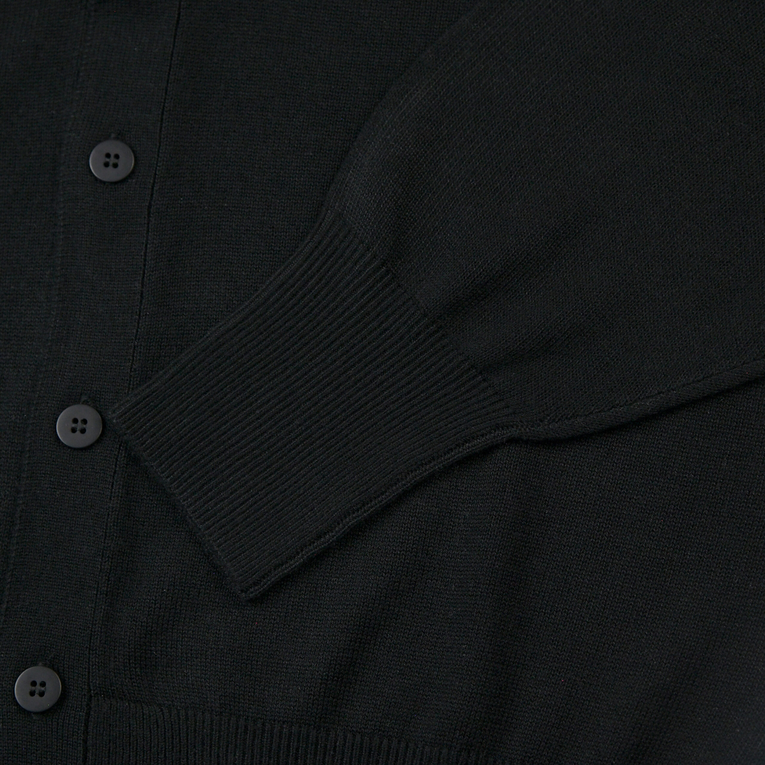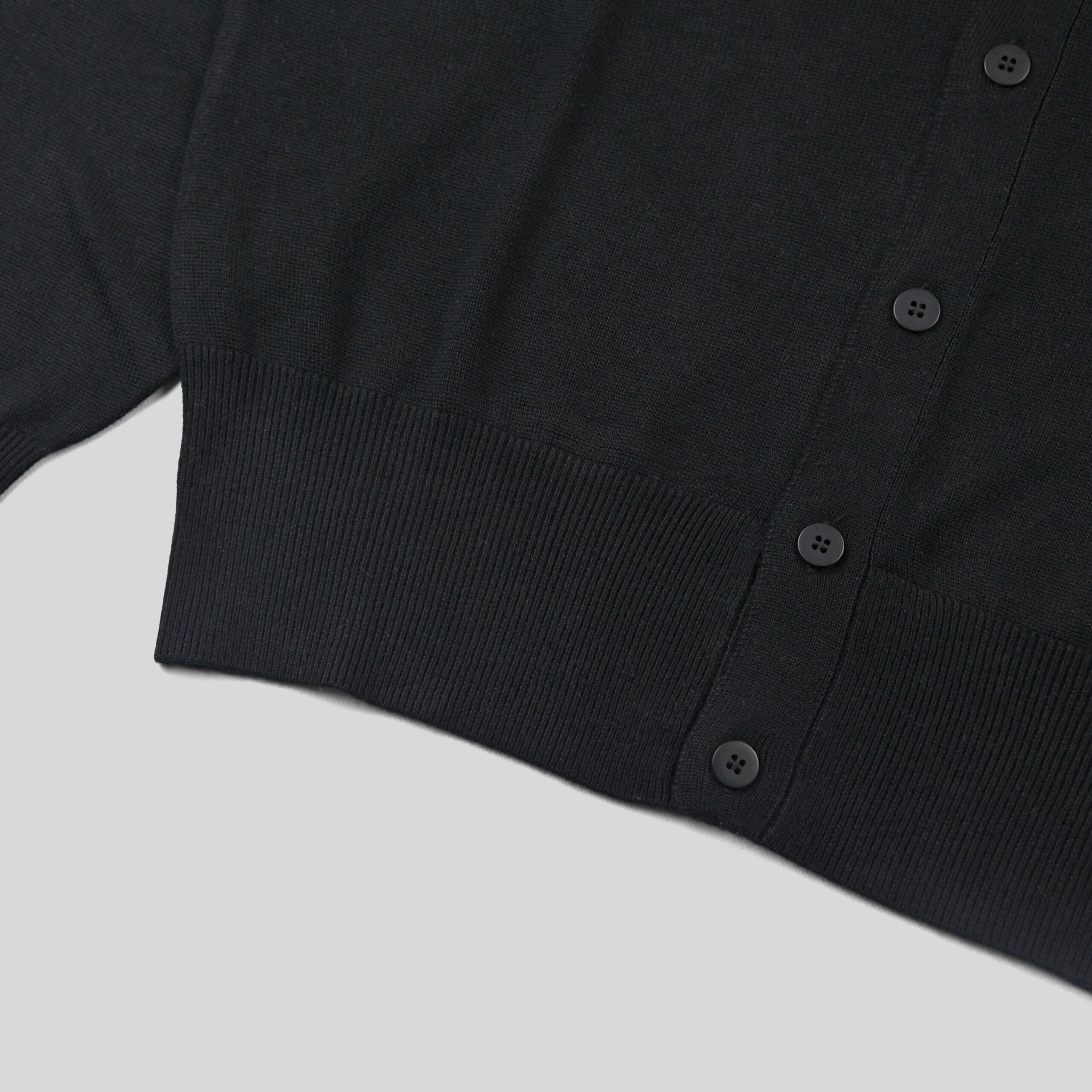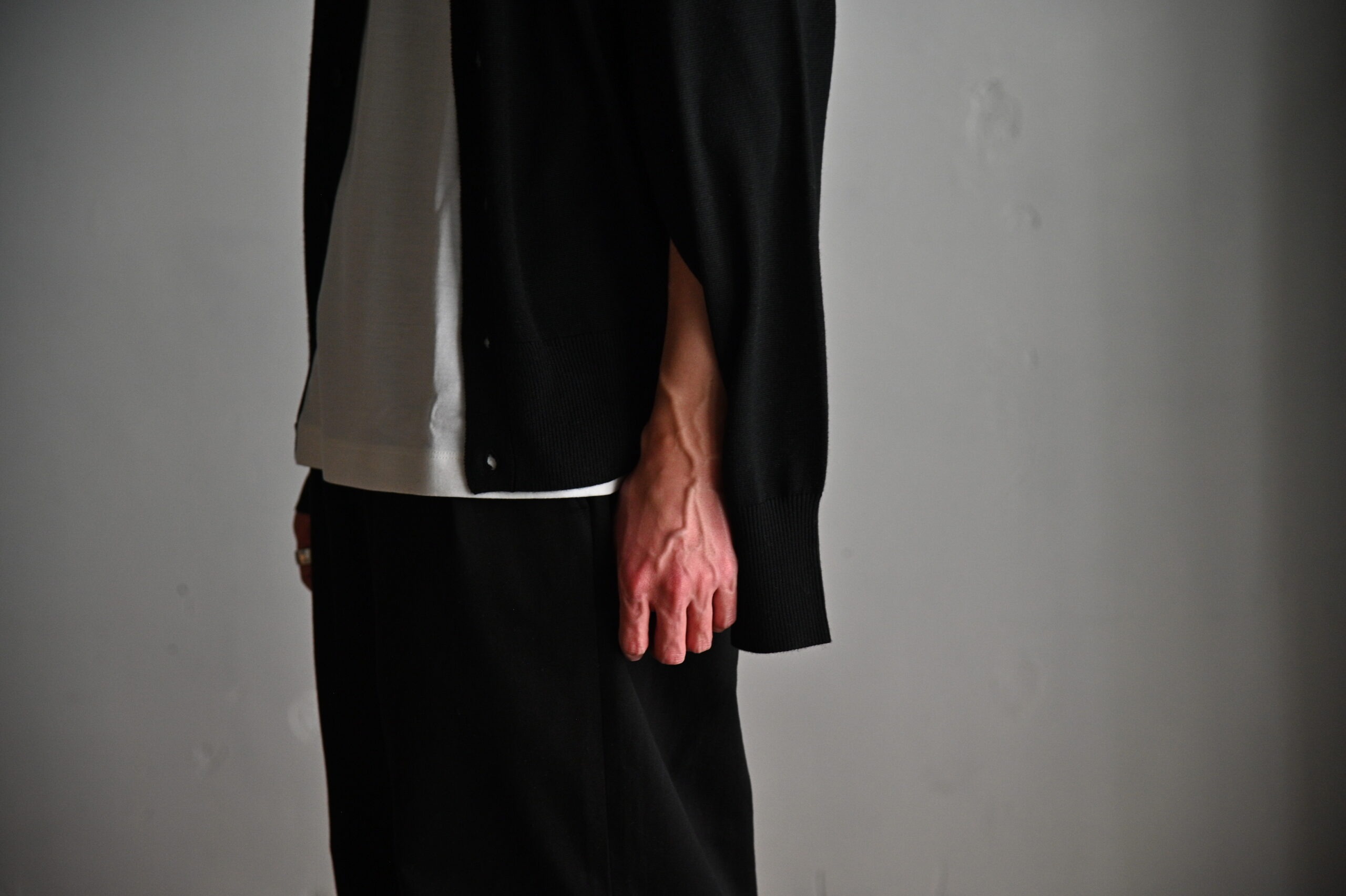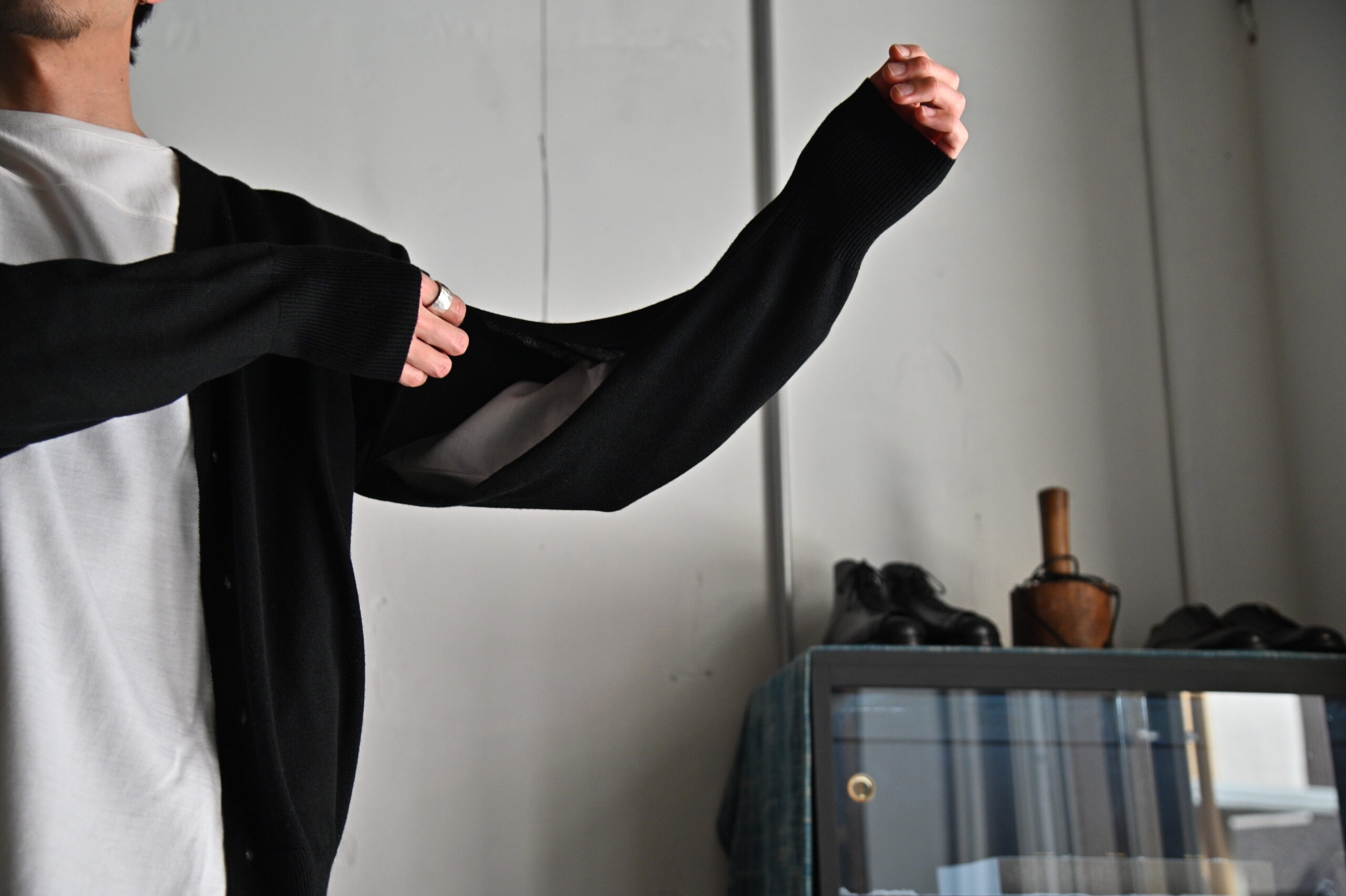 オーソドックスなカーディガンのパターンワークに、袖下には腕を外に逃すためのホールを設置。