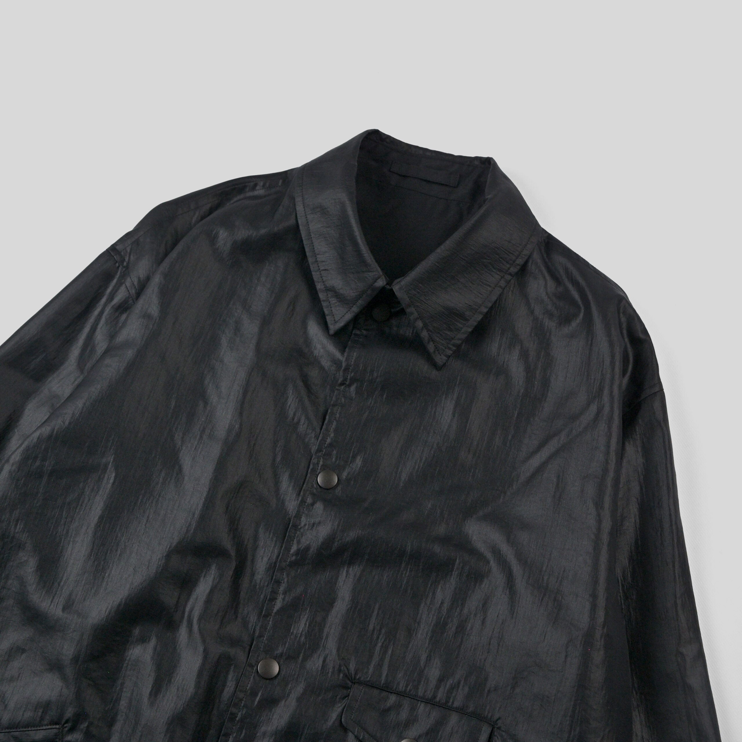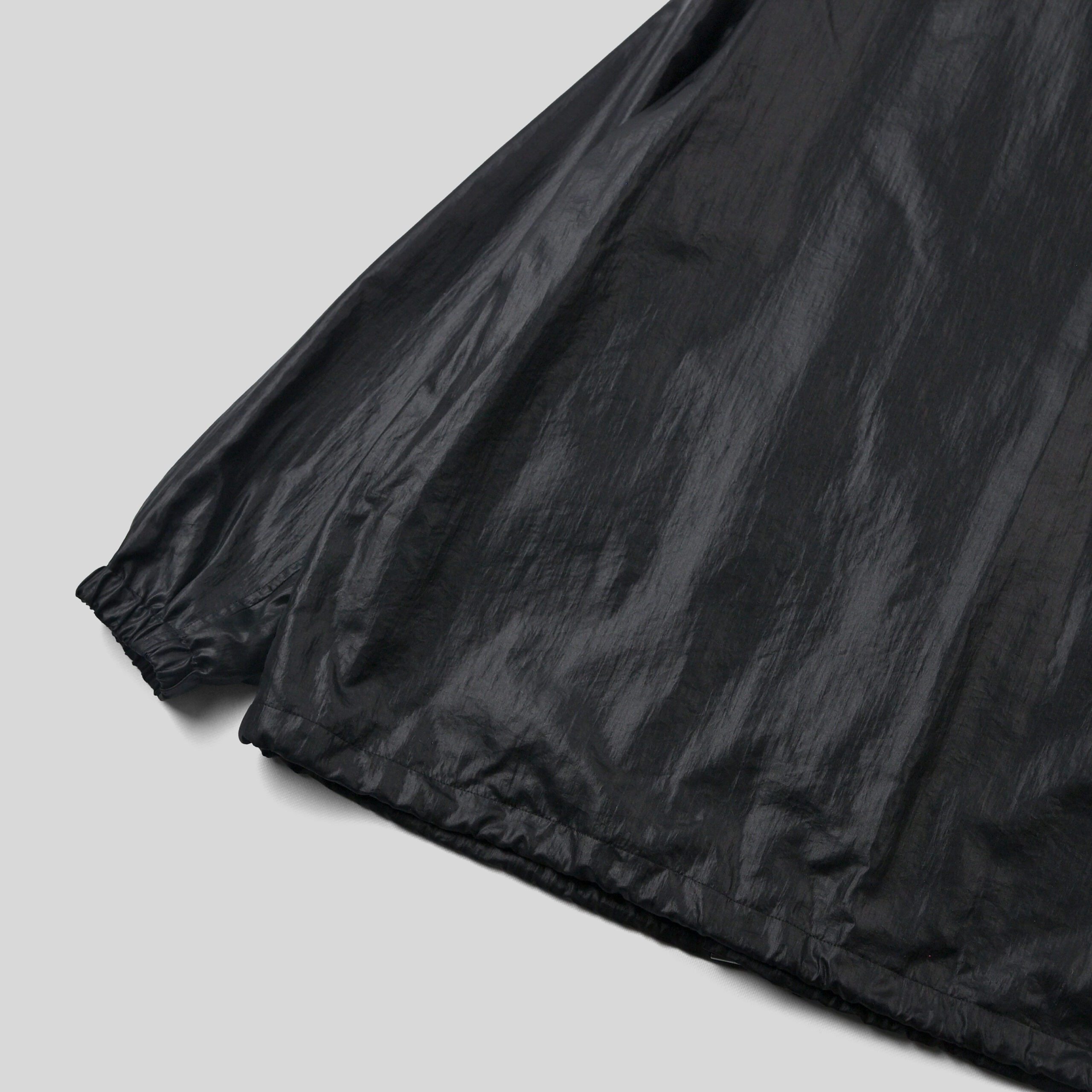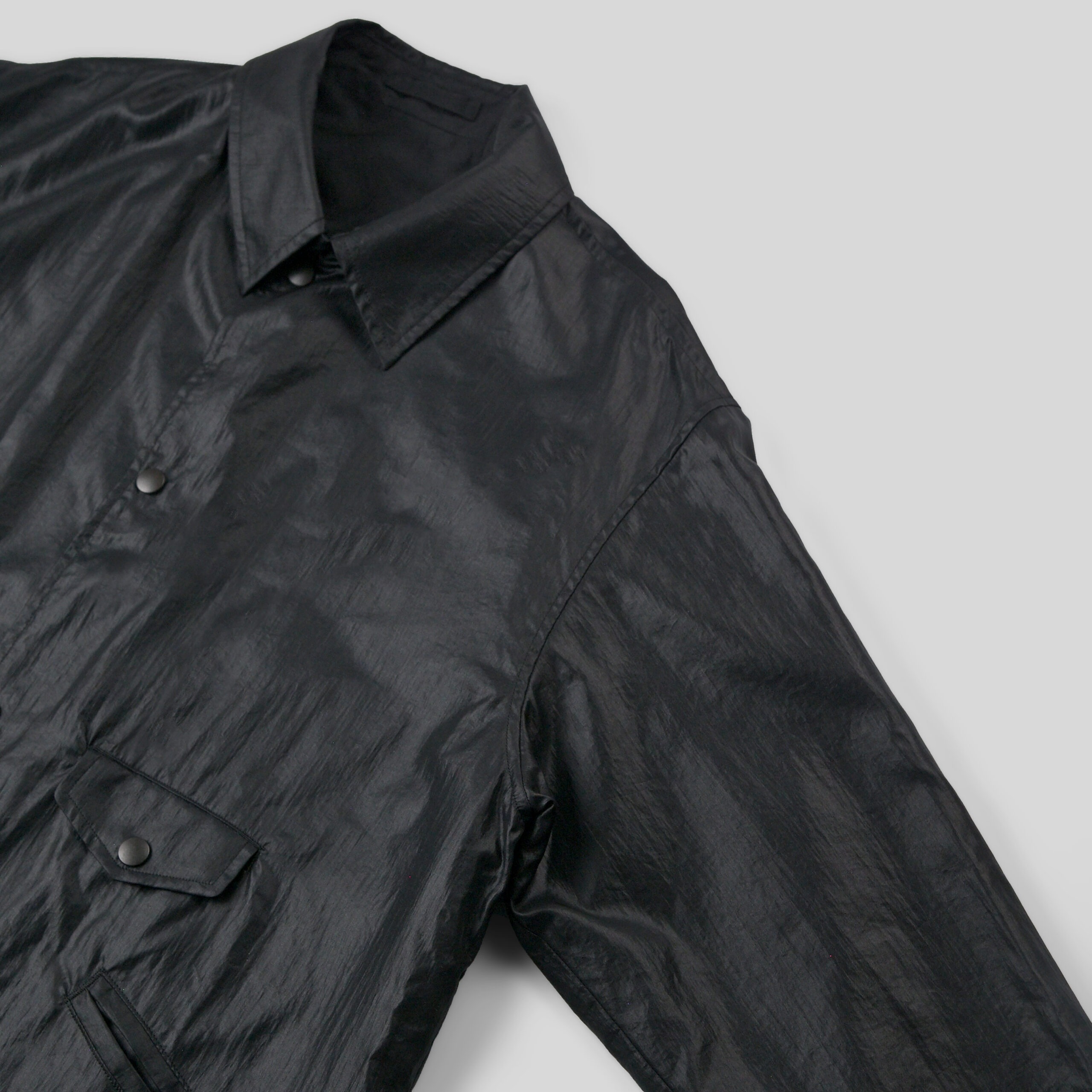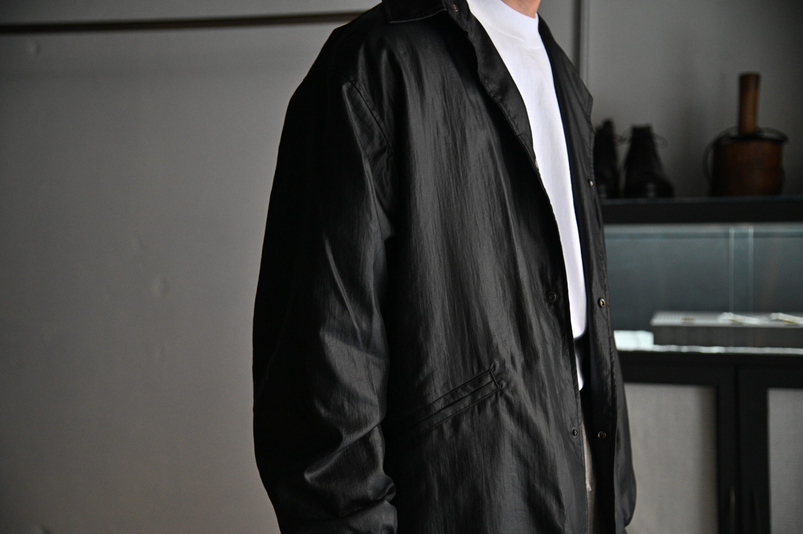北陸産地にて細番手で薄手に織り上げたナイロンタフタ。仕上げに熱と圧力を加えて加工することで、光沢とシボ感を出しレザーの様な表情に仕上げています。